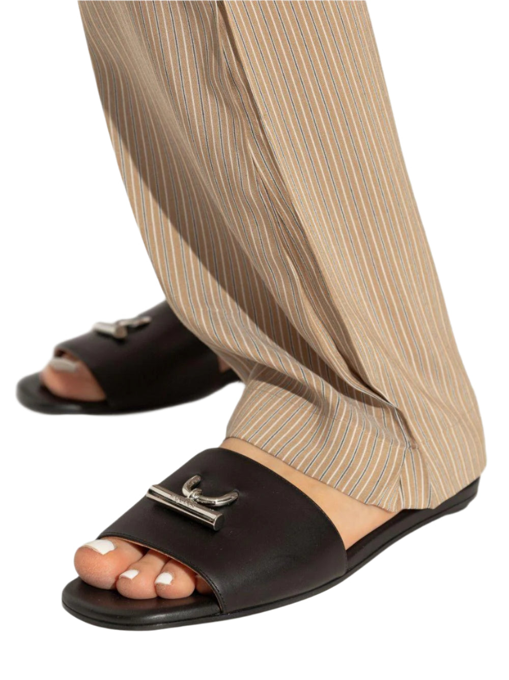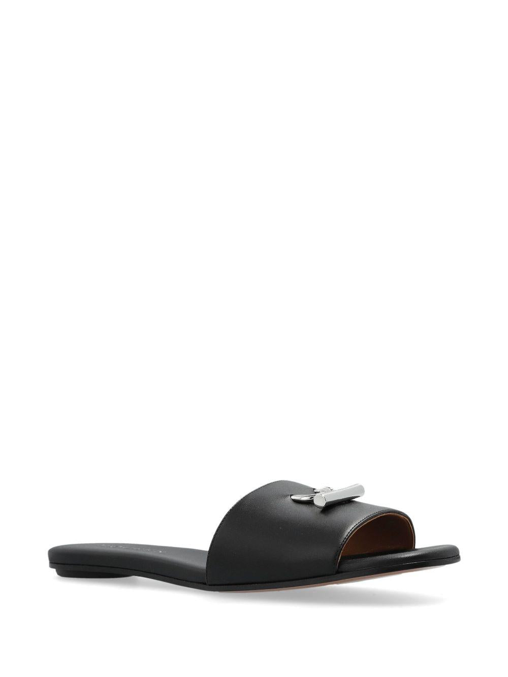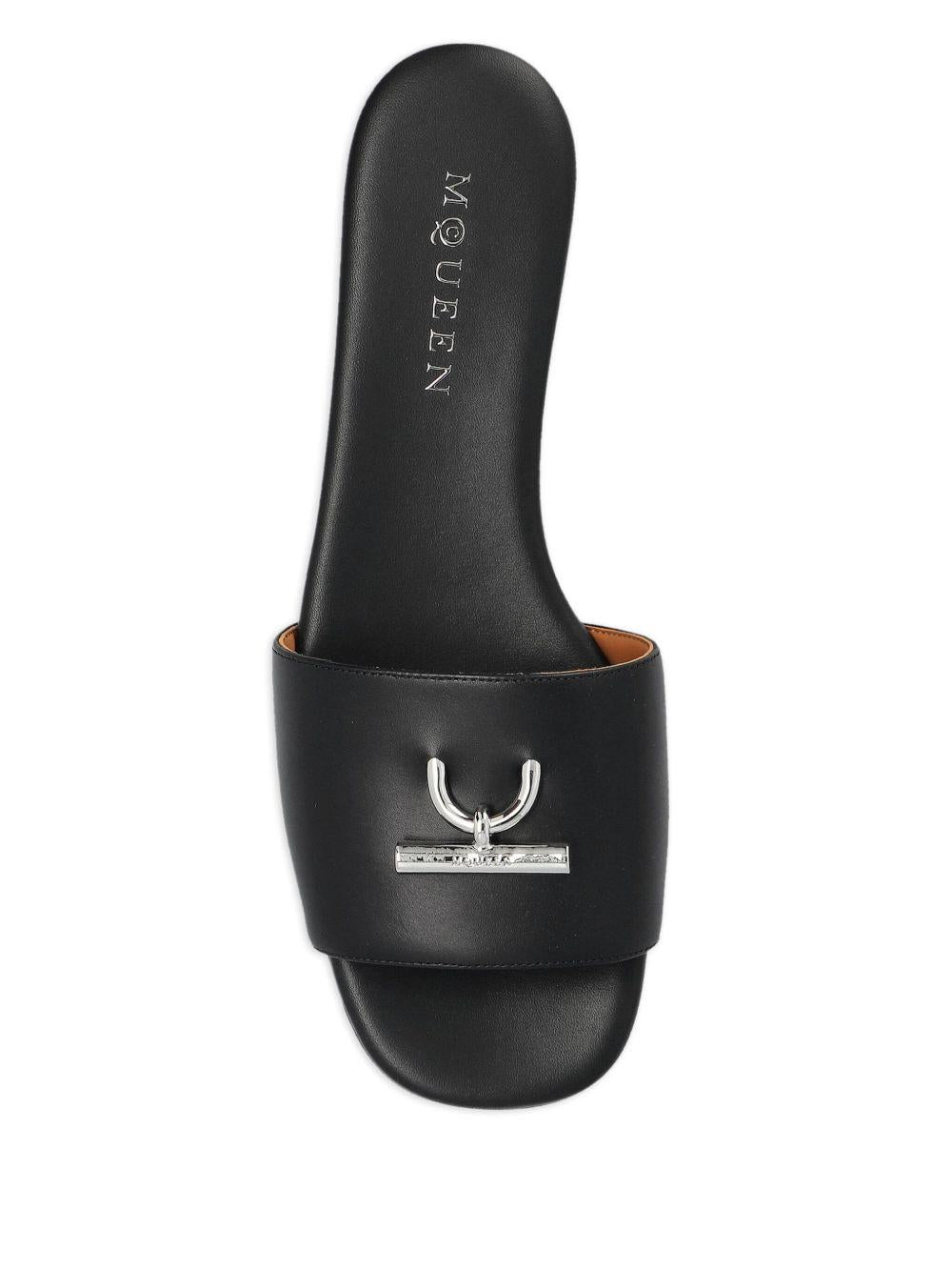 يُميّز الجلد الأسود الناعم صندل T-Bar المسطح، بمقدمة مستديرة أنيقة ولمسات معدنية فضية مميزة على شكل T. شعار ماكوين الشهير محفور بأناقة على كل تفصيلة، مما يضفي لمسة من الرقي على هذا التصميم البسيط. خيارٌ مثاليٌّ لإطلالة أنيقة وعفوية.