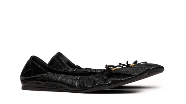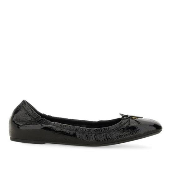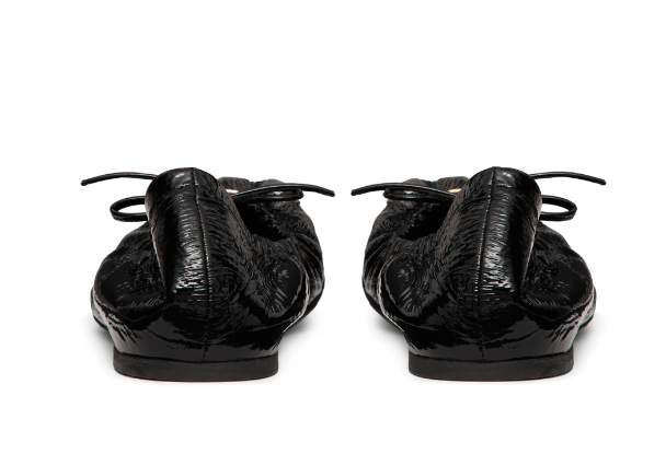 حذاء باليرينا أسود اللون يتميز بجزء علوي من جلد الماعز بلمسة نهائية لامعة مع لمسات من الكشكشة، مزين بشعار VLogo. مصمم بمقدمة مربعة ونعل مسطح، مما يوفر سهولة الارتداء. انظر قسم الجلود.