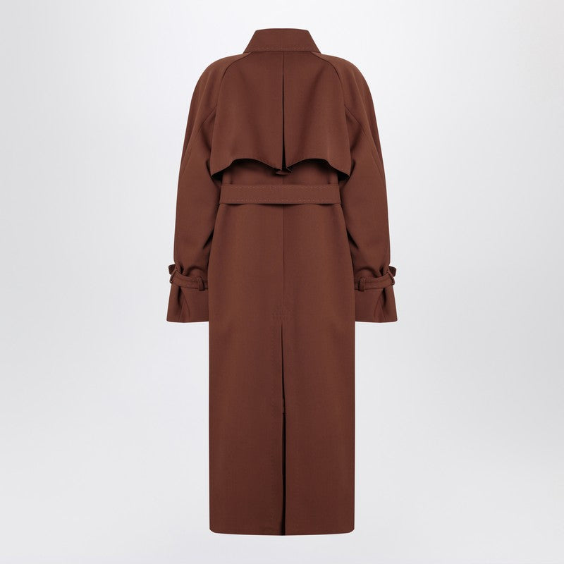 معطف ترنش بني من مزيج الصوف من ماكس مارا أتيليه، مصنوع من قماش الجبردين المقاوم للماء. يتميز بفتحة خلفية واسعة، وغطاء أمامي قابل للتعديل، وأكمام طويلة مع أزرار جلدية، وجيبين جانبيين، وحزام جلدي مطابق. يُحكم المعطف بزر للإغلاق، كما يتميز بفتحة خلفية لسهولة الحركة. صنع في إيطاليا من مواد عالية الجودة.