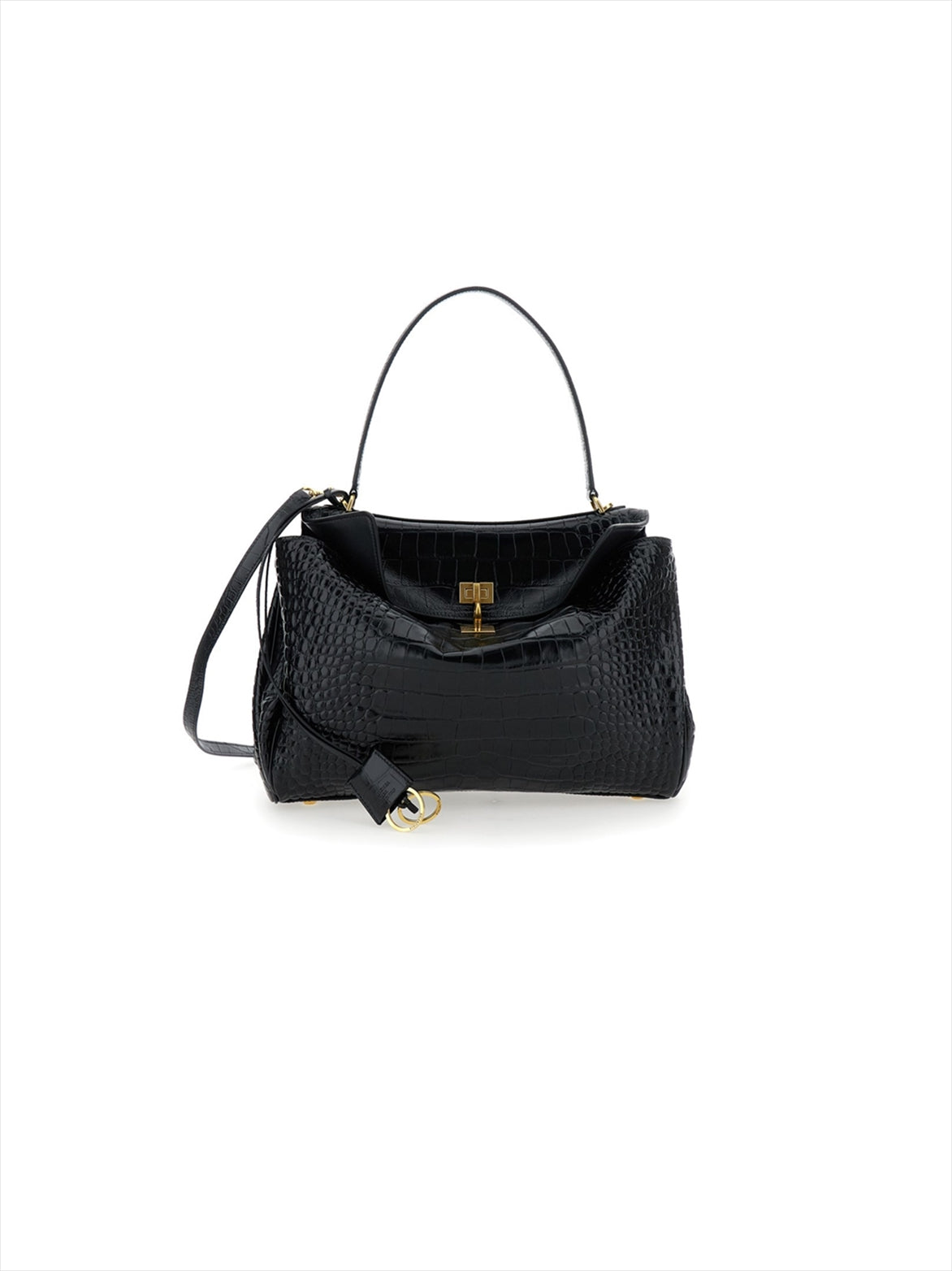 حقيبة كتف من جلد العجل بنقشة جلد التمساح المتقنة. تتميز هذه الحقيبة بتصميم أنيق، ومقبض علوي، وحزام كتف قابل للتعديل، وقفل دوار محكم. ومن بين الميزات الإضافية حامل مفاتيح قابل للإزالة وجيبان خلفيان لسهولة التخزين. جلد الحقيبة الناعم محمي بأرجل معدنية لضمان المتانة. صُنعت في إيطاليا.