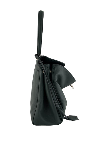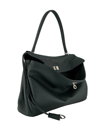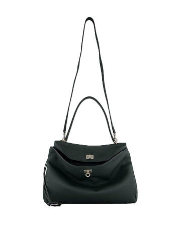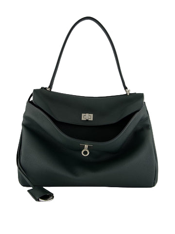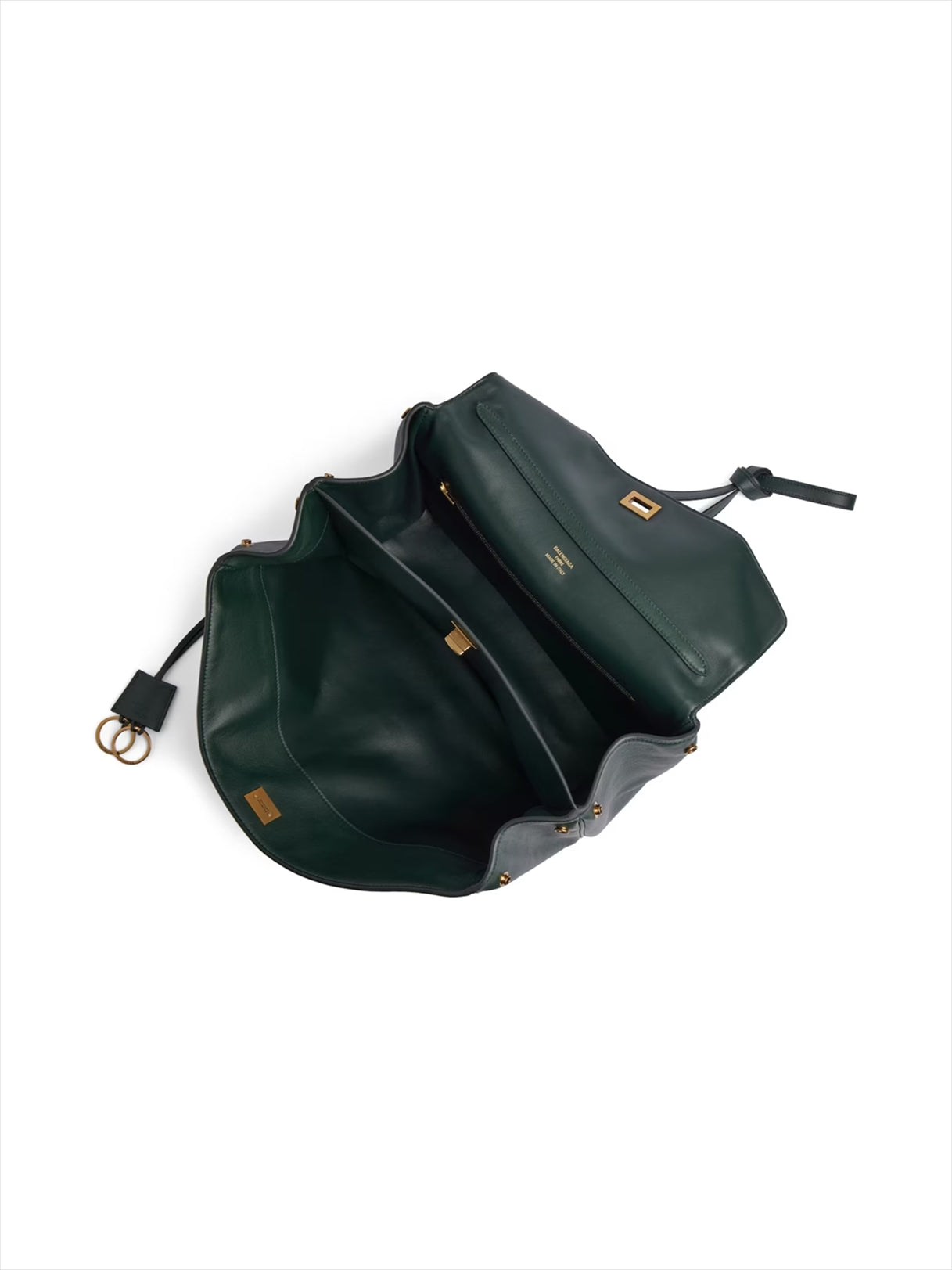 حقيبة روديو متوسطة الحجم من جلد العجل الناعم بلون أخضر صنوبري، مزينة بأجزاء معدنية ذهبية عتيقة. تصميم أنيق وراقي، يجمع بين البساطة والحرفية العالية.