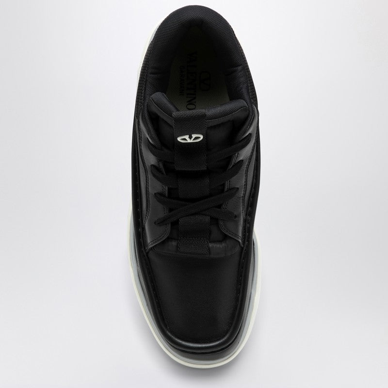 حذاء رياضي أسود من جلد العجل والقماش من فالنتينو غارافاني، يتميز بمقدمة مستديرة أنيقة وخياطة بارزة جريئة. يُضفي رباط الإغلاق وتفاصيل شعار V المميز على اللسان والظهر لمسة من الفخامة. يوفر النعل المطاطي المتين قاعدة متينة، بينما يضمن التصميم الأنيق خطوة واثقة وسهلة.