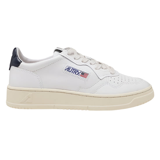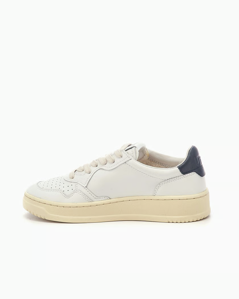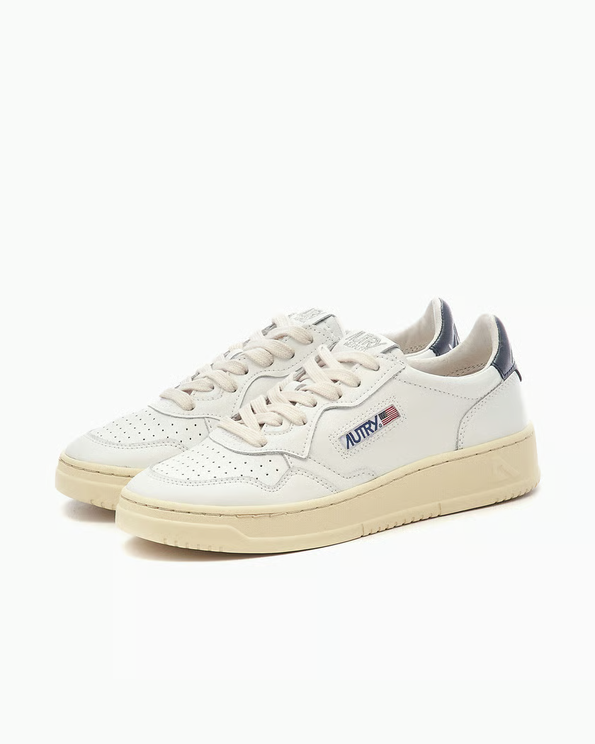 تتميز أحذية Autry 01 الرياضية النسائية المنخفضة بتصميم من جلد العجل الأبيض، مع لمسة باللون الأزرق الداكن على الكعب مما يضفي عمقًا ورقيًا على مظهرها المصقول والأنيق بالفعل.