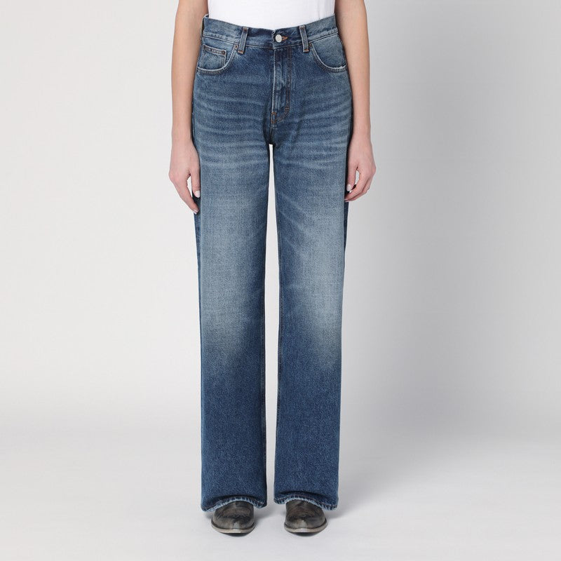 بنطال جينز بخصر عالٍ من قماش الدنيم الأزرق الباهت، مصنوع من قطن إيطالي فاخر. تصميم كلاسيكي بخمسة جيوب، يتميز بسحاب أمامي وأزرار للإغلاق، مع حلقات حزام عملية ورقعة شعار في الخلف. تصميم كلاسيكي يدوم طويلاً.