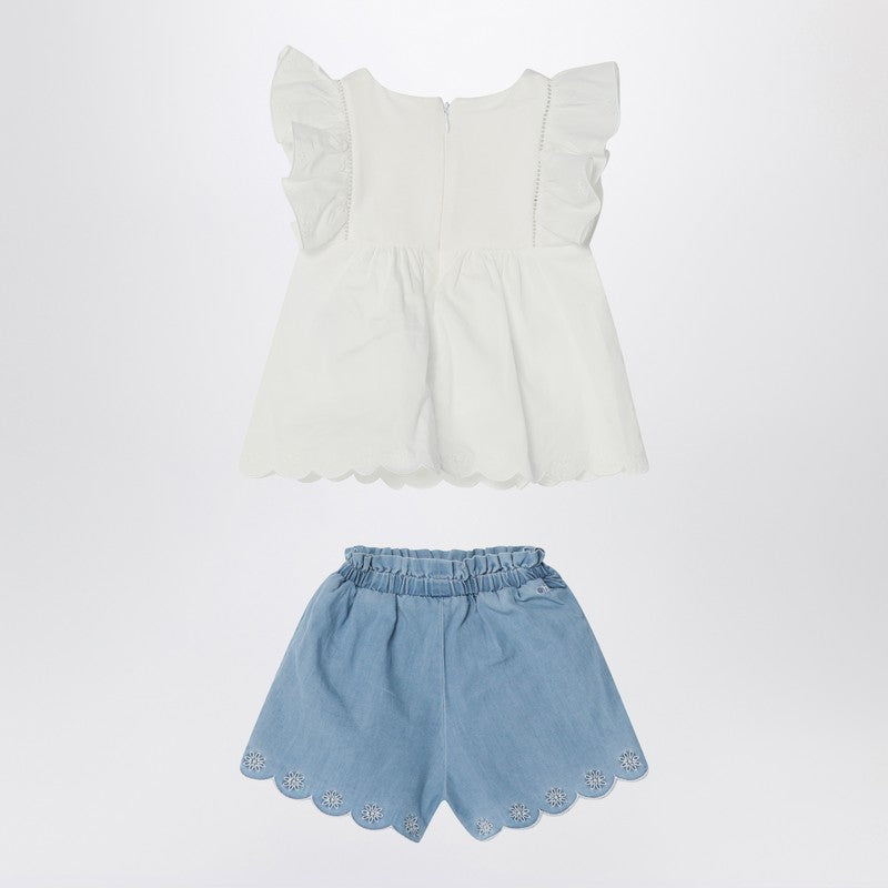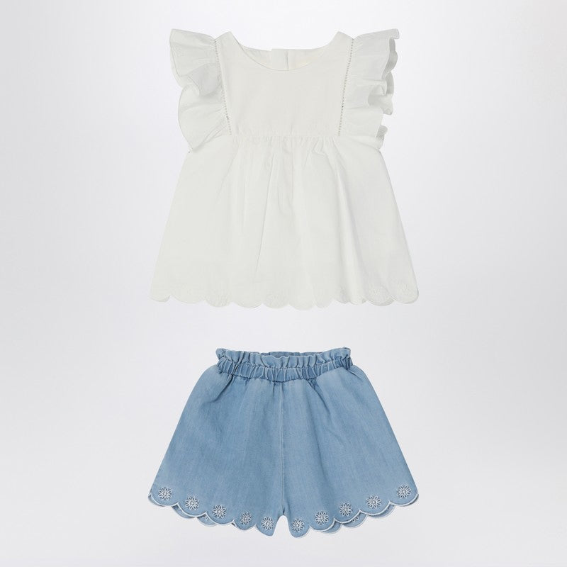 توب قطني ناعم بياقة دائرية وسحاب خلفي. يتميز بحاشية متموجة وأكمام مكشكشة. يمكن تنسيقه مع شورت أزرق متناسق بخصر مطاطي وحاشية متموجة مطرزة. هذا الطقم المكون من قطعتين مثالي للارتداء الكاجوال. **تفاصيل المنتج:**