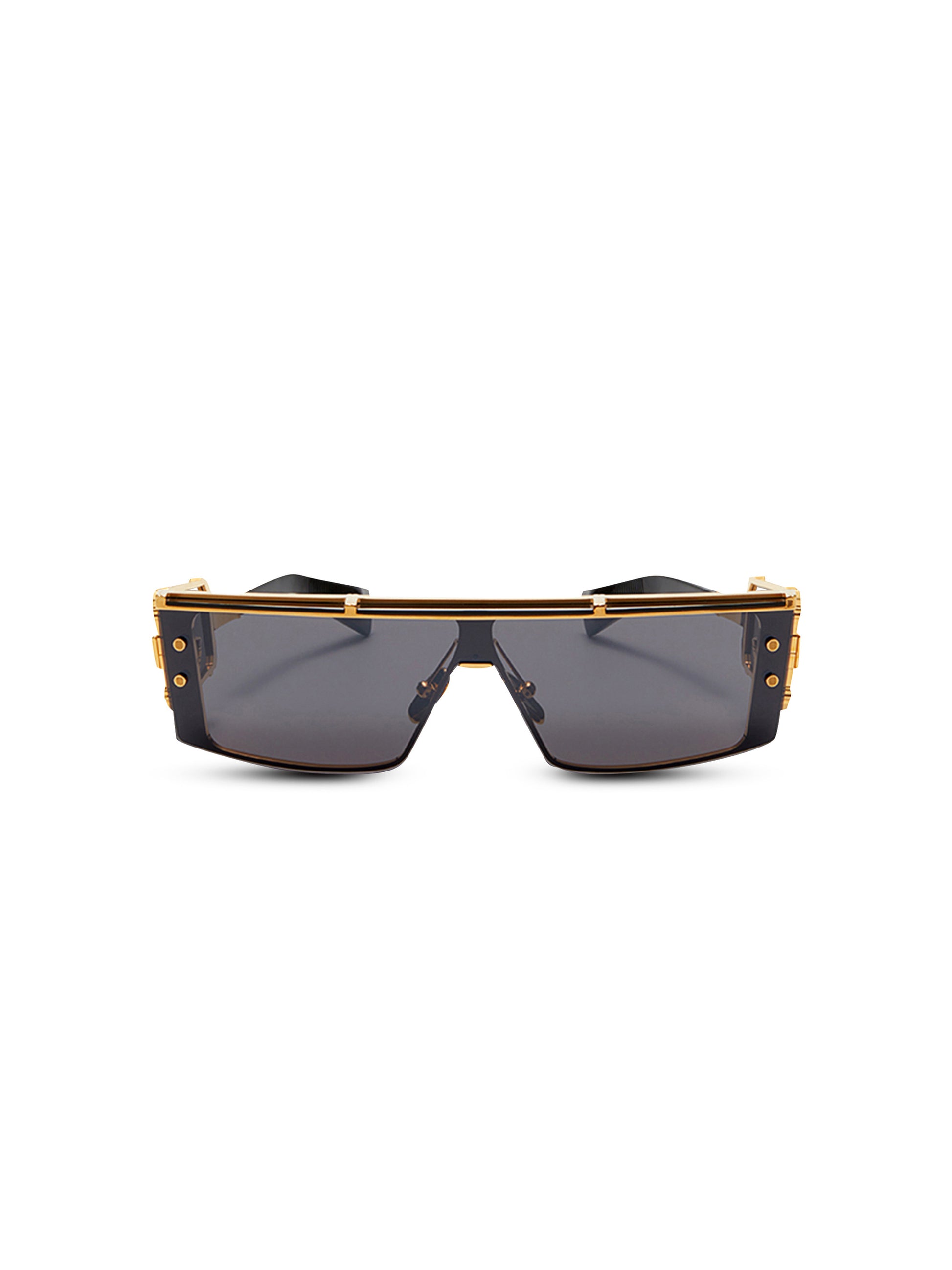 تتميز إطارات التيتانيوم الكبيرة بتصميم درع، وأذرع عريضة باللونين الذهبي والأسود، وشعار بالمان الذهبي. توفر العدسات الرمادية المضادة للتوهج حماية كاملة من الأشعة فوق البنفسجية. تحمل العلبة المرفقة شعار بالمان.