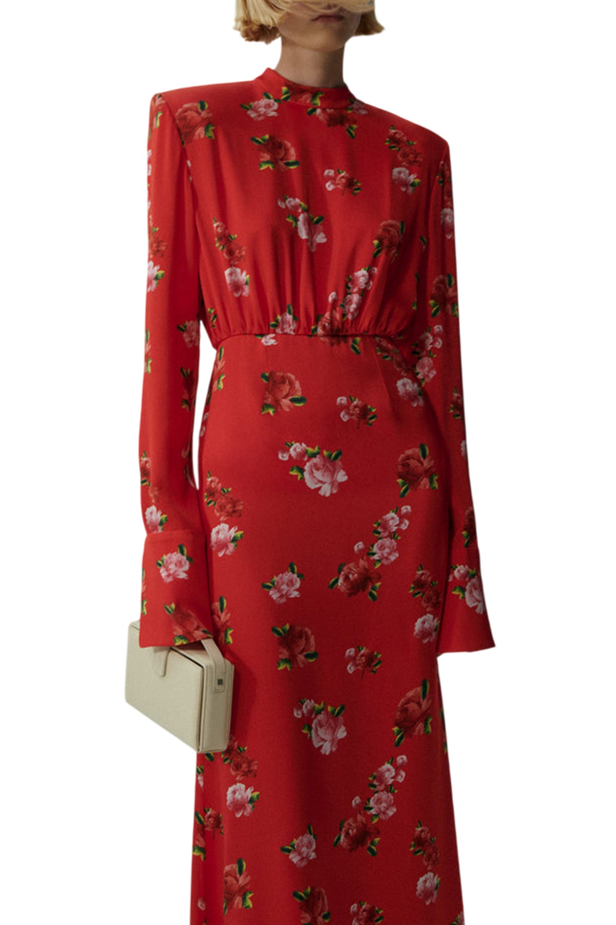 Elevate your evening style with this refined round-neck gown, boasting a sleek cinched waist and fluid, floor-sweeping skirt. The delicate folds of the design create a sophisticated silhouette, while the seasonal floral pattern adds a touch of whimsy and romance.