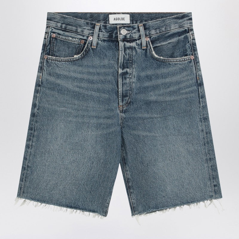 Blue Regenerated Cotton Denim Shorts by AGOLDE. This iconic pair features a front zip and button closure, five classic pockets, and a raw hem. Finished with belt loops and a clean silhouette, these shorts are a staple for any warm-weather wardrobe. Made from sustainable regenerated cotton denim in Turkey, they exude effortless style and durability.