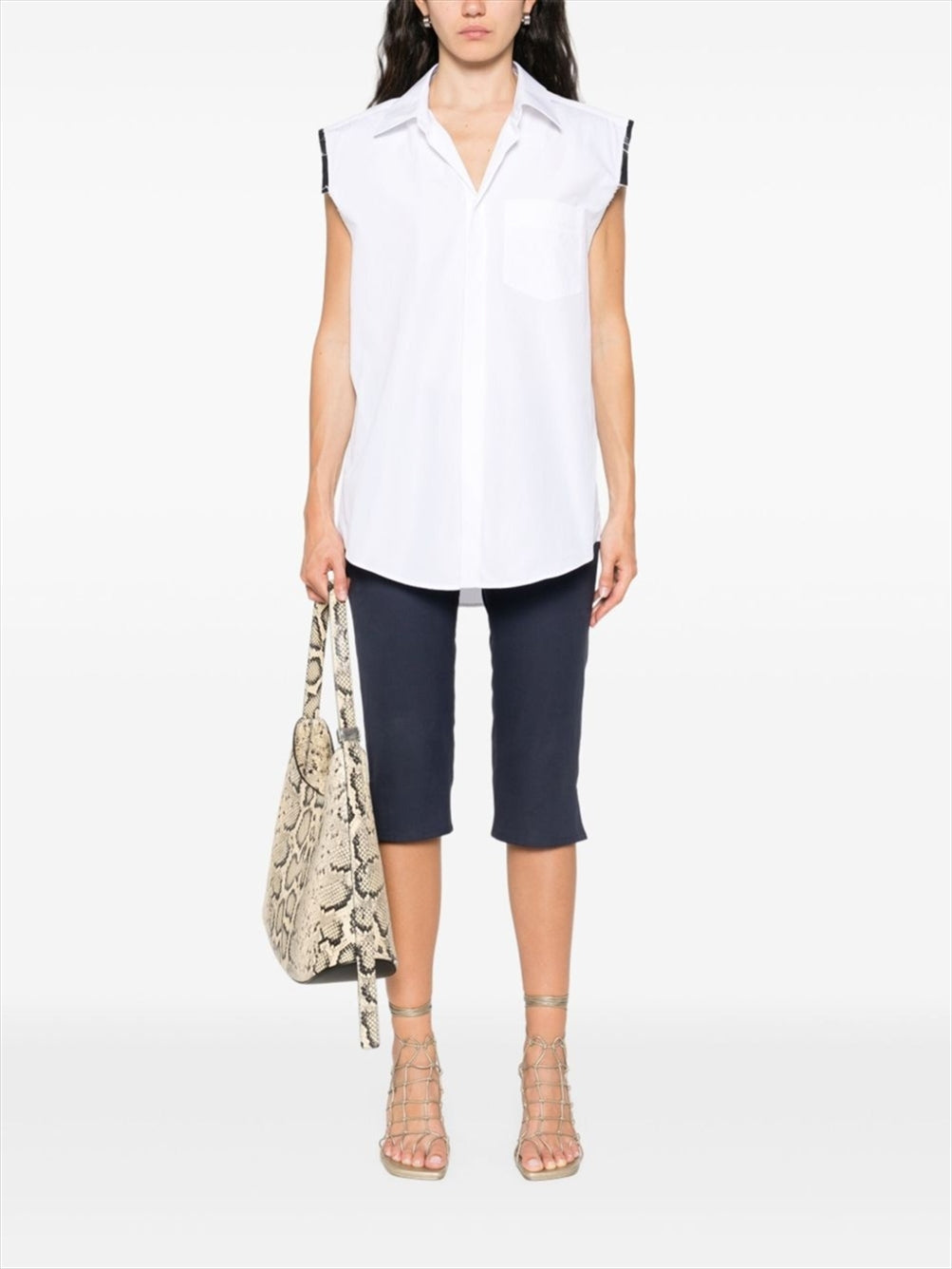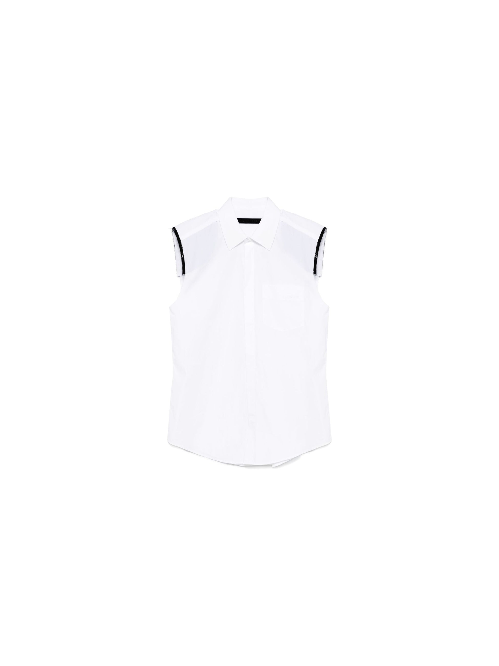Elevate your style with our versatile white shirt featuring a layered shoulder detail. A discreet button-front closure and chest pocket complete this sleeveless design, perfect for effortless office-to-weekend transitions. Available in .