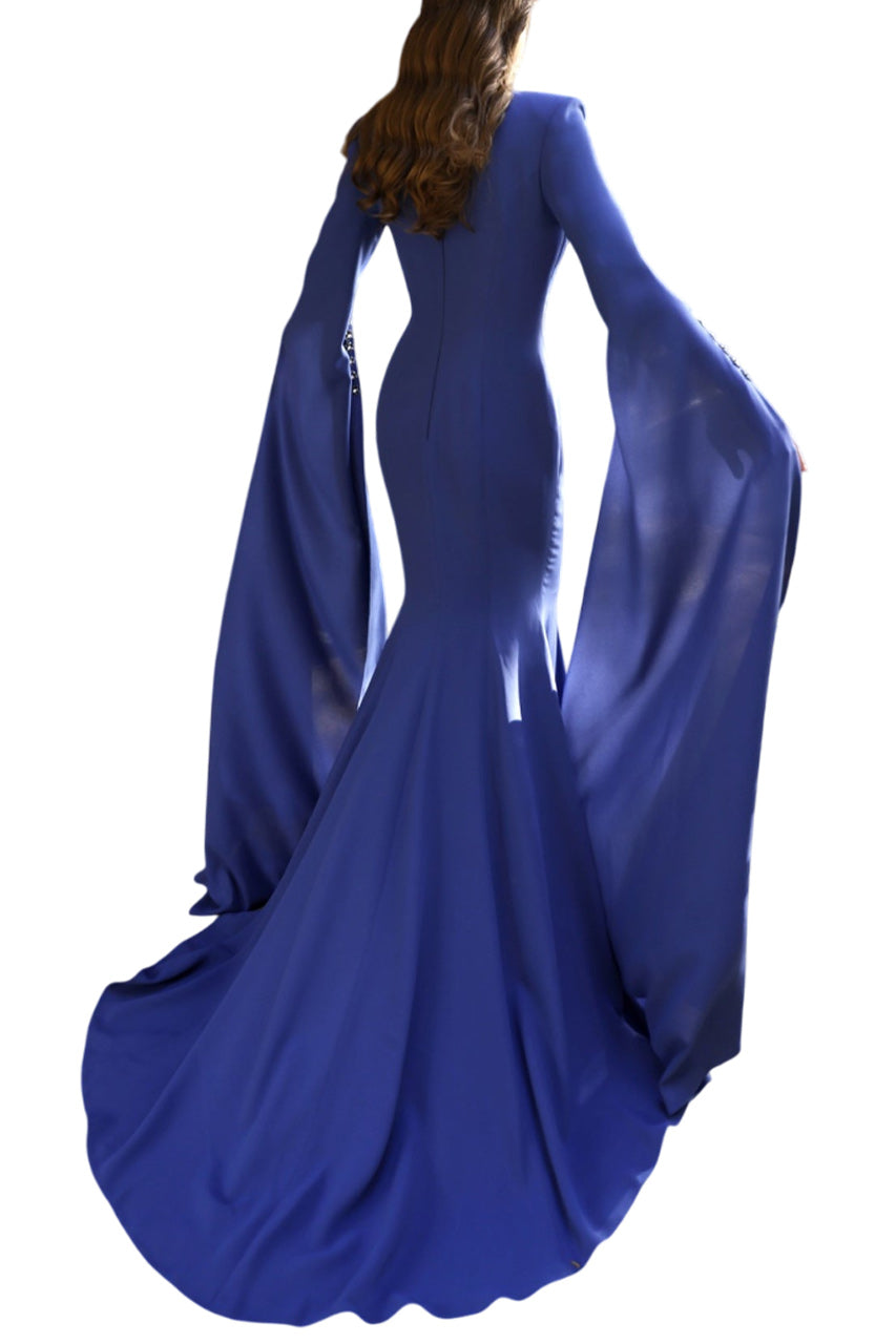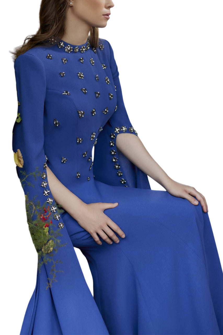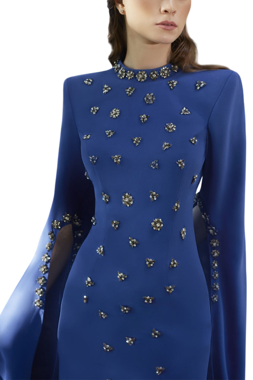 Elevate your style with this stunning Royal Blue Gown by Bilal El Dana. Adorned with intricate jeweled embellishments, the high neckline and cape sleeves add a touch of artistry to this elegant design. Perfect for your special occasion, this gown will make you feel like royalty.