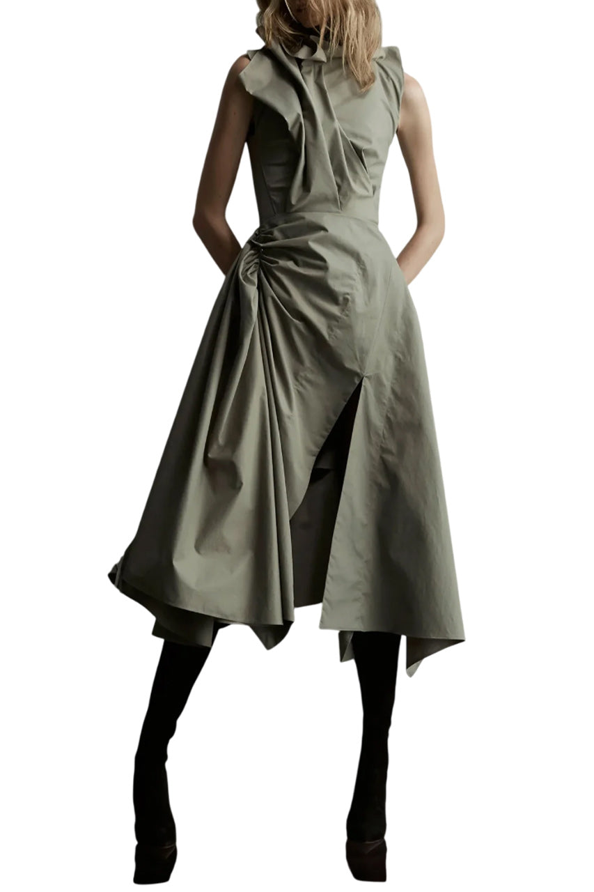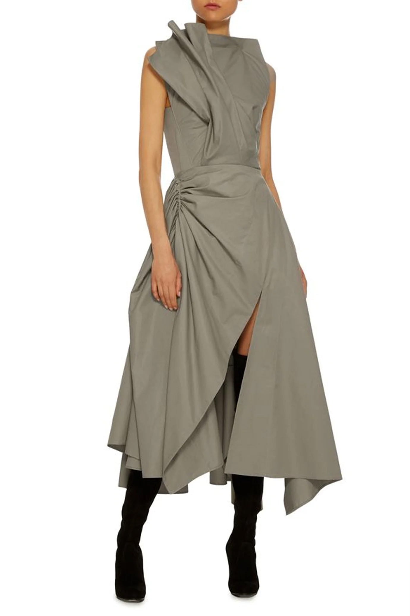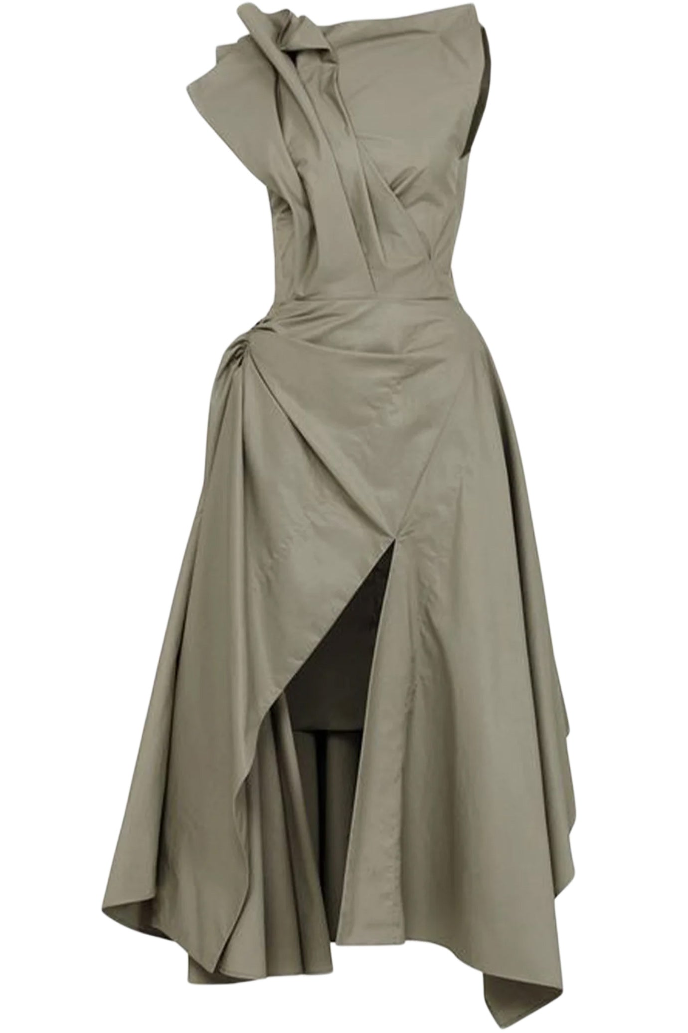 Animalia Dress is a sophisticated asymetrical midi dress, perfect for any occasion. Made from high-quality cotton, this dress features a stylish slit that adds an element of modernity. With its impeccable construction, it is both comfortable and elegant. Elevate your wardrobe with this unique creation.