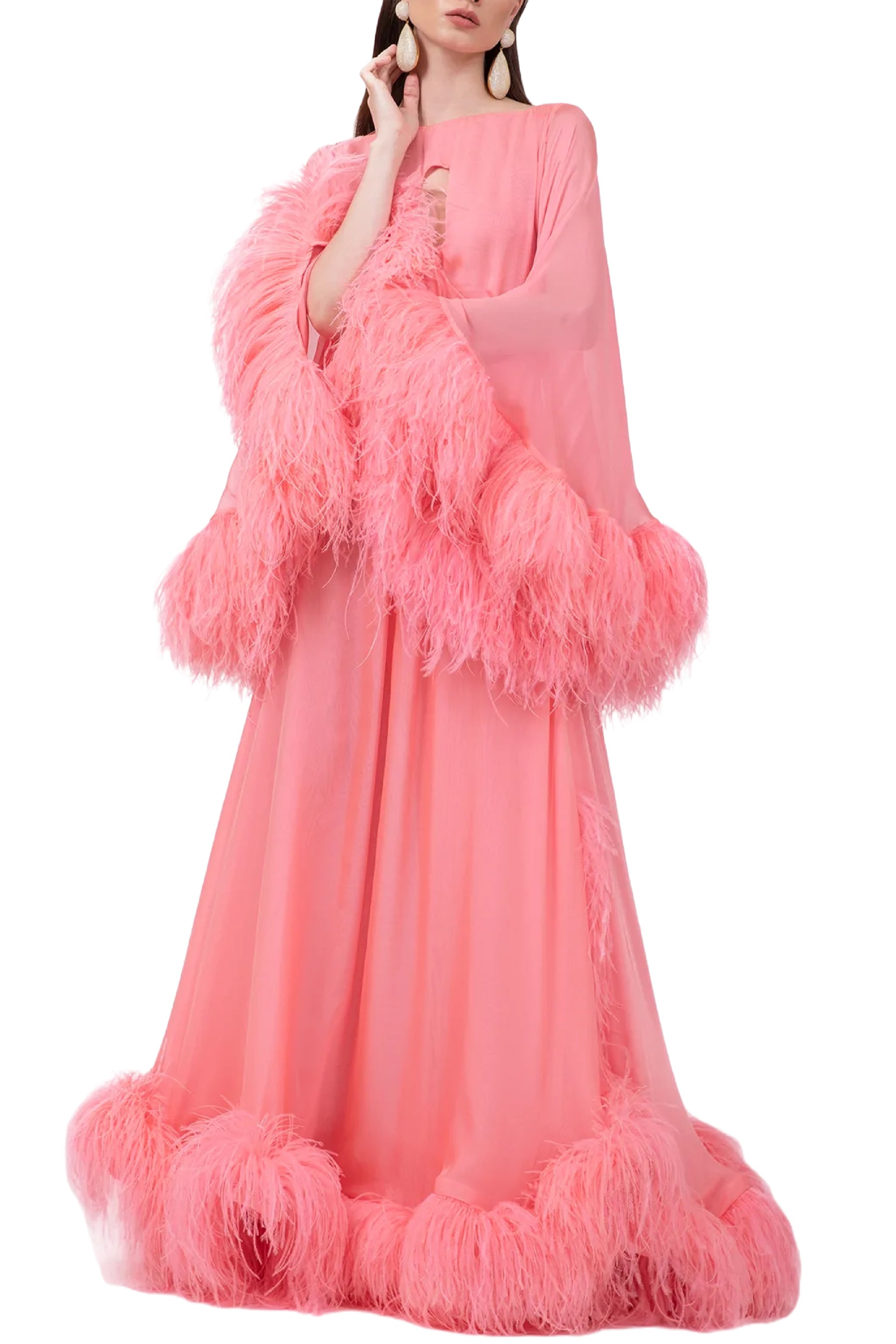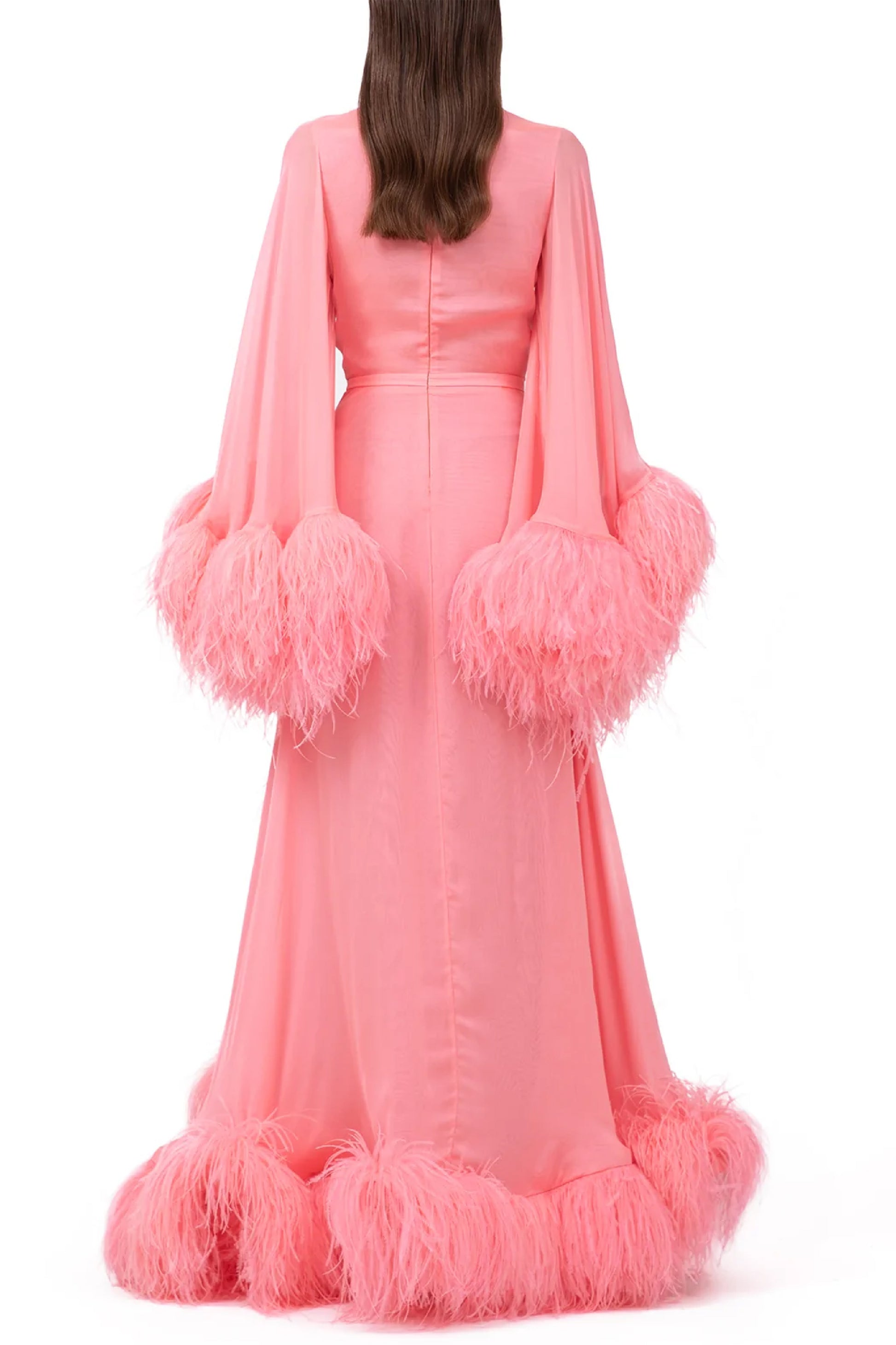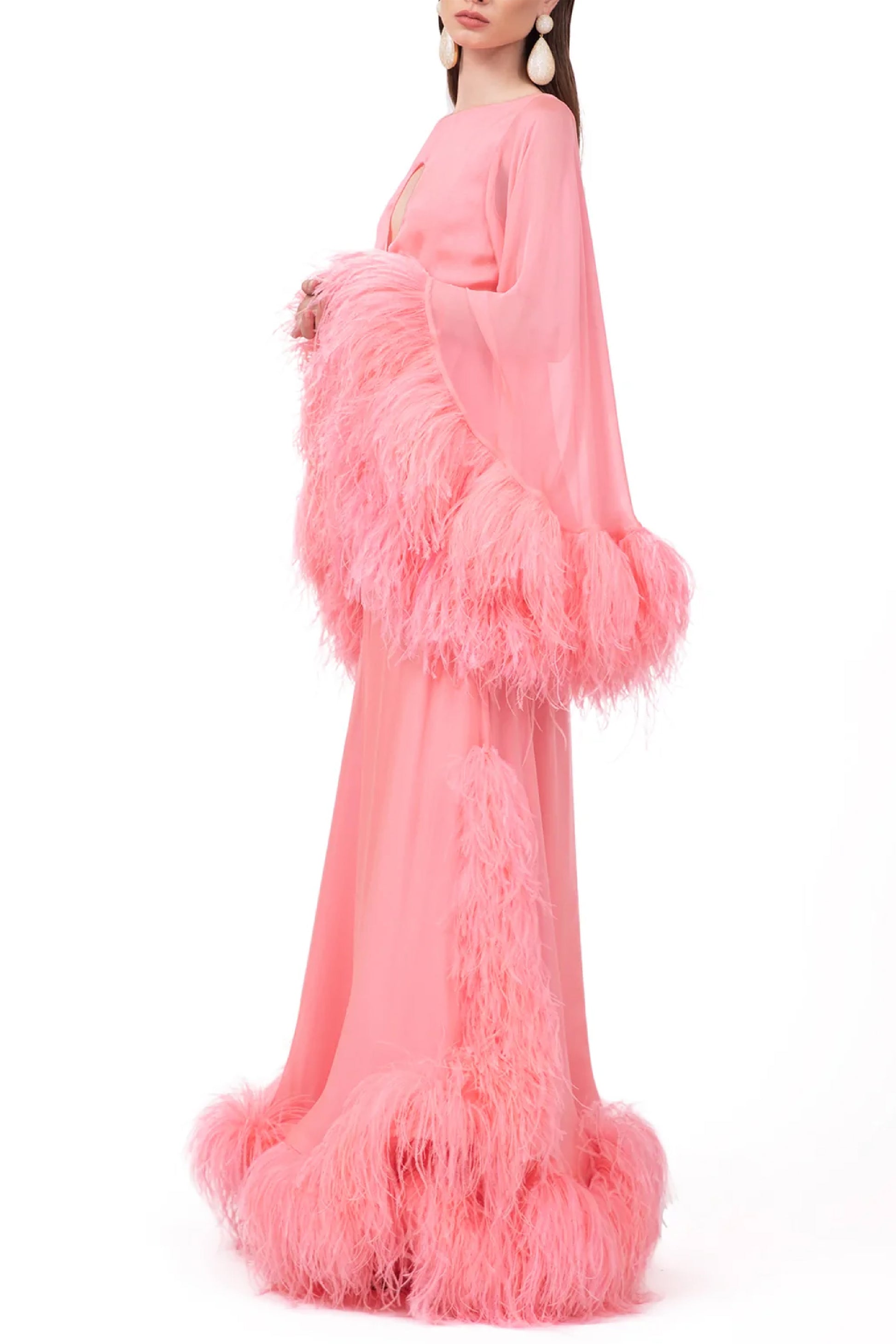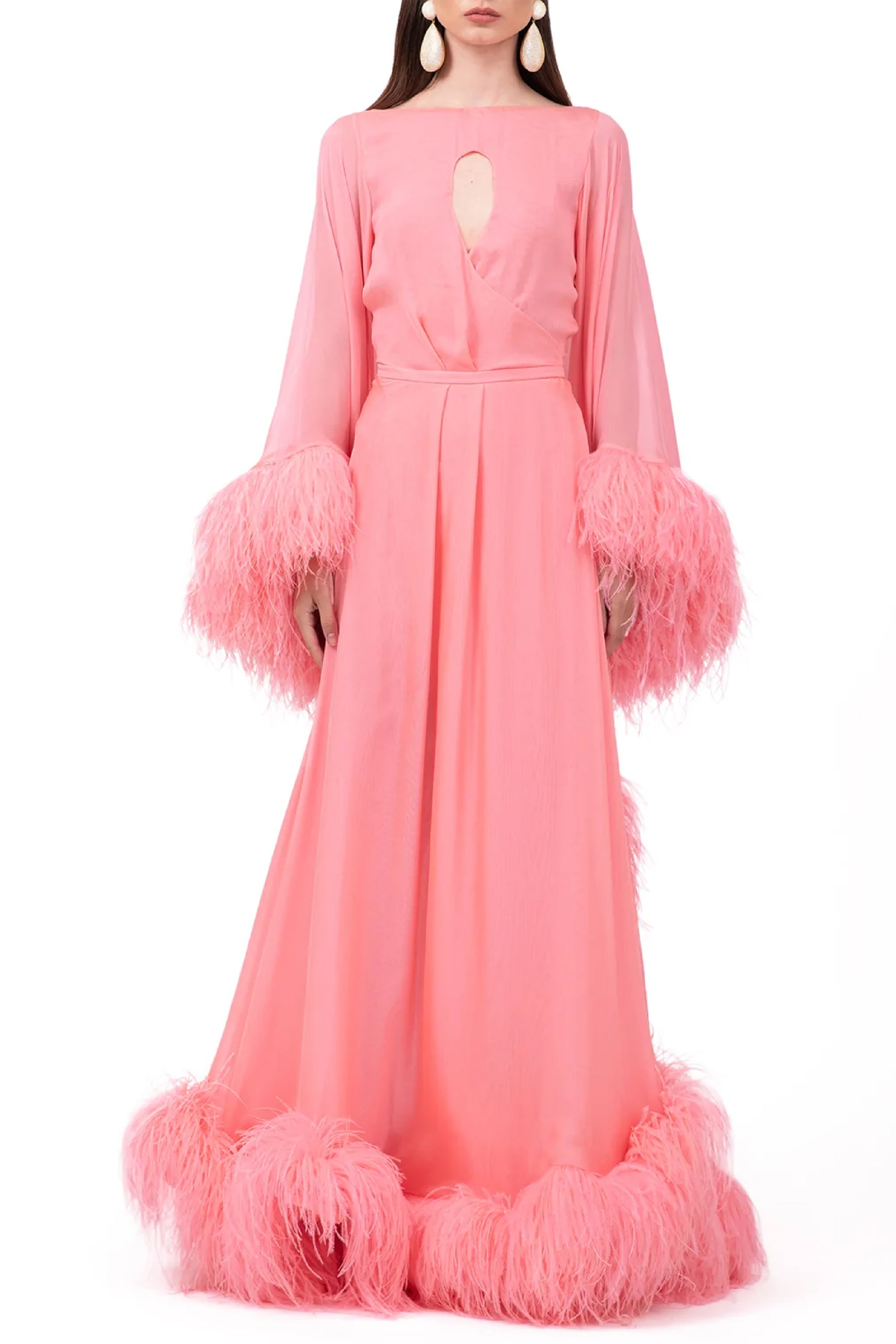 This wrap-inspired long silk dress unfolds to showcase the house's signature tear drop cutout and wispy feather trims along the sleeves and hem.