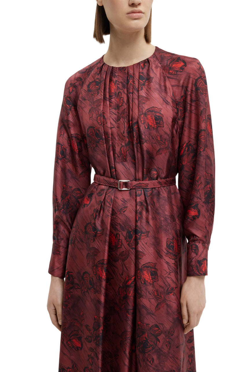The Bahiti dress in red roses on marble print silk twill is the epitome of elegance and sophistication. Made from luxurious silk twill, this midi dress boasts a delicate red rose design on a striking marble background. Its high neckline and slim belt create a beautifully tailored silhouette, making it perfect for formal occasions.