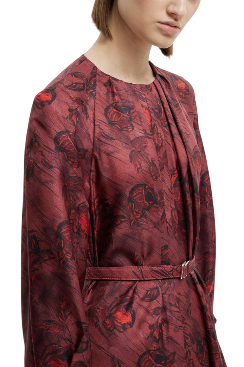BAHITI DRESS IN RED ROSES ON MARBLE PRINT SILK TWILL