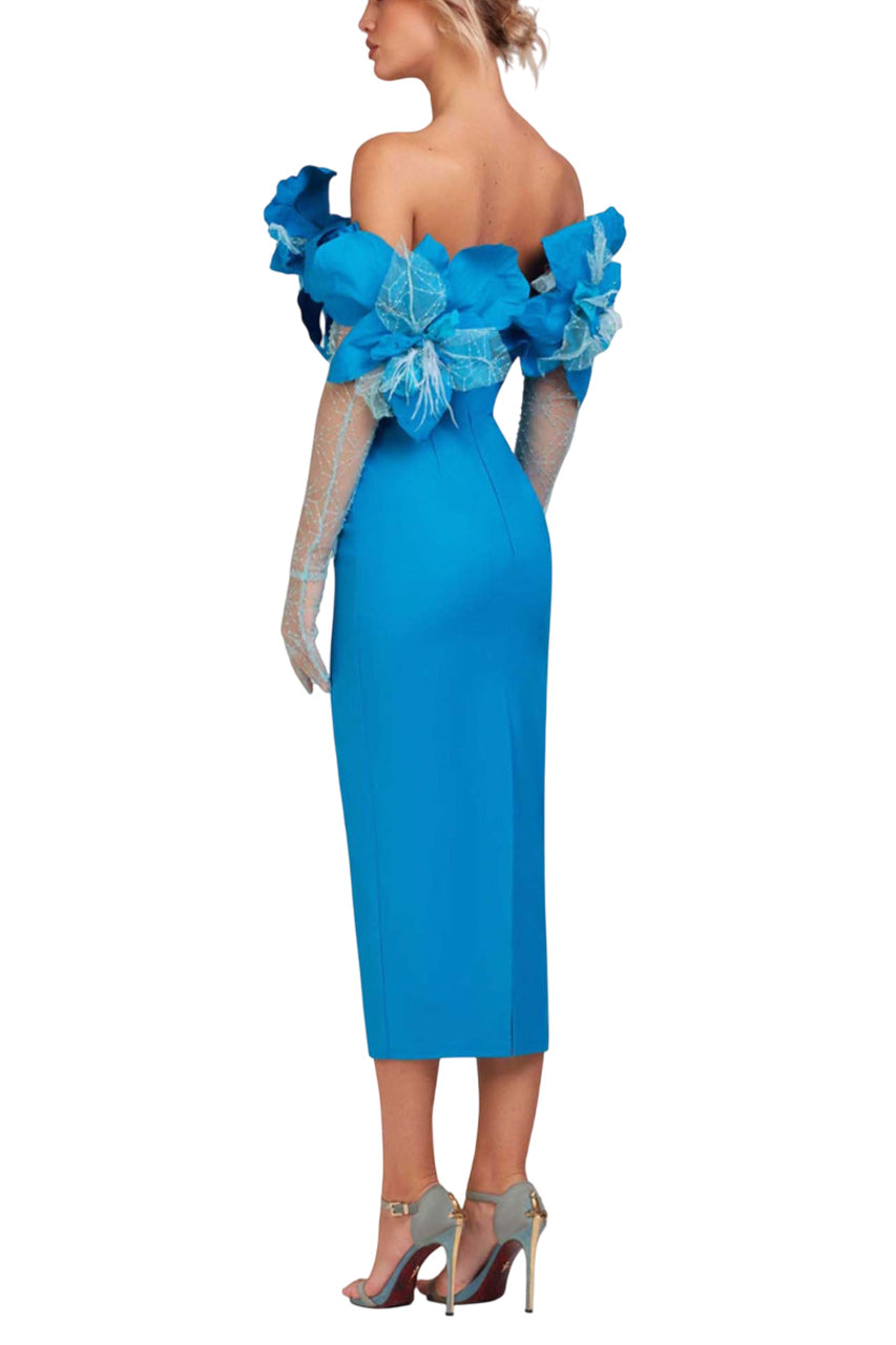 Introducing the Blue Off-Shoulder Floral Dress - a stunning and captivating dress that perfectly combines elegance and power. The vivid blue color and form-fitting silhouette will make a lasting impression at any high-class event. With oversized floral embellishments and delicate embroidery, this dress exudes femininity and grace.