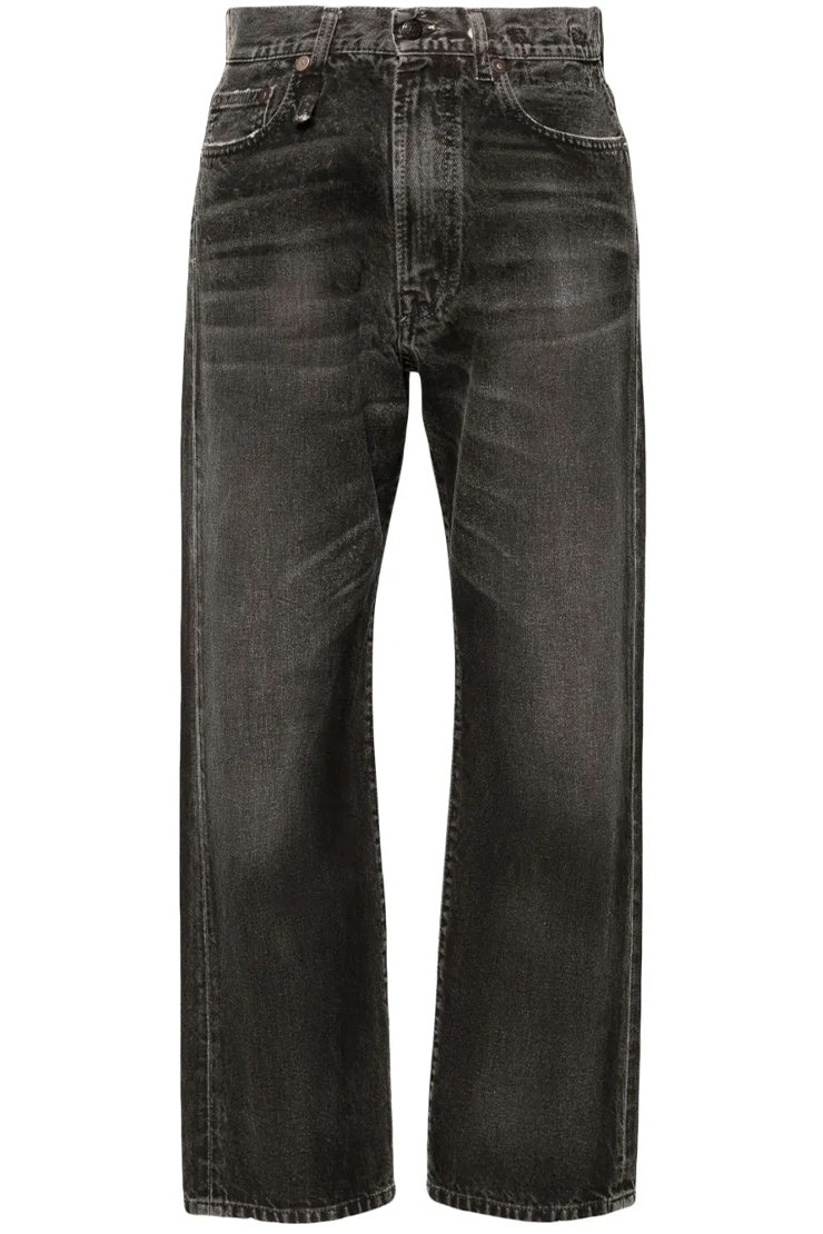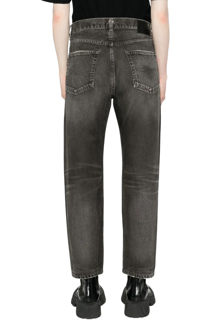 Mid-rise boyfriend jeans in cotton with a distressed finish. Concealed zip-fly and button fastening, along with belt loops and classic five pockets. Rivets and subtle whiskering at the thighs add a trendy touch. Ankle-length cut. Logo patch at the rear.