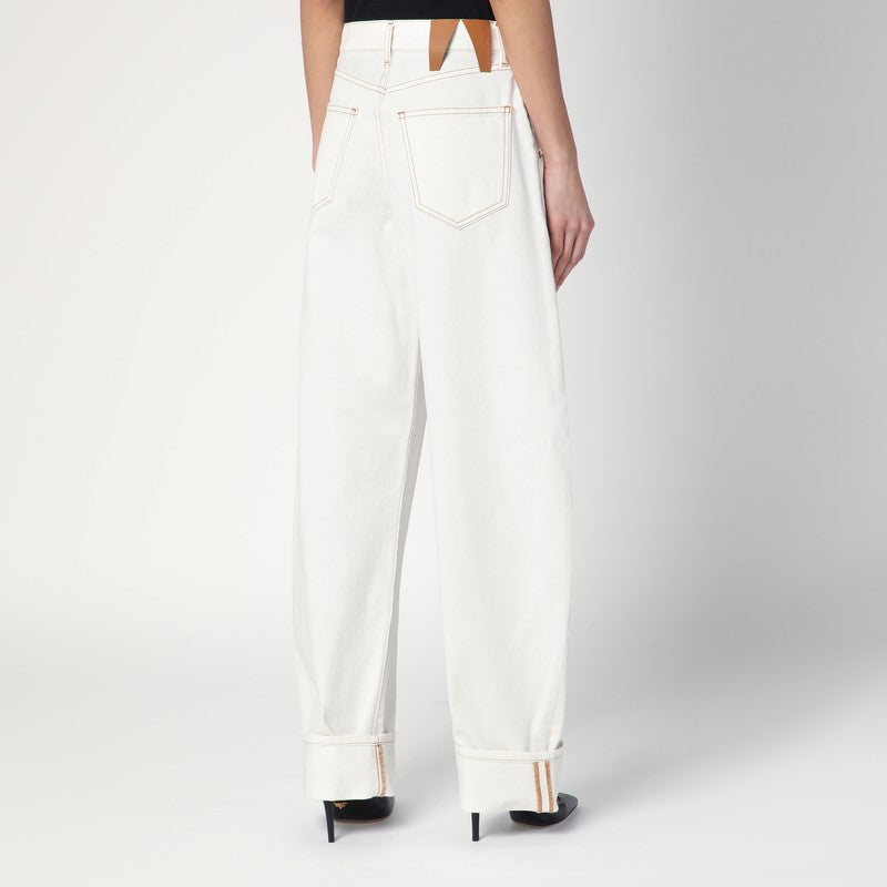 White cotton denim balloon jeans by DARKPARK, featuring a faded finish and classic design. A front zip and button closure, belt loops, and five pockets create a functional silhouette. The leg is finished with a cuff and a patch adorns the back. Made in Italy from high-quality denim, these jeans are perfect for effortless summer style.