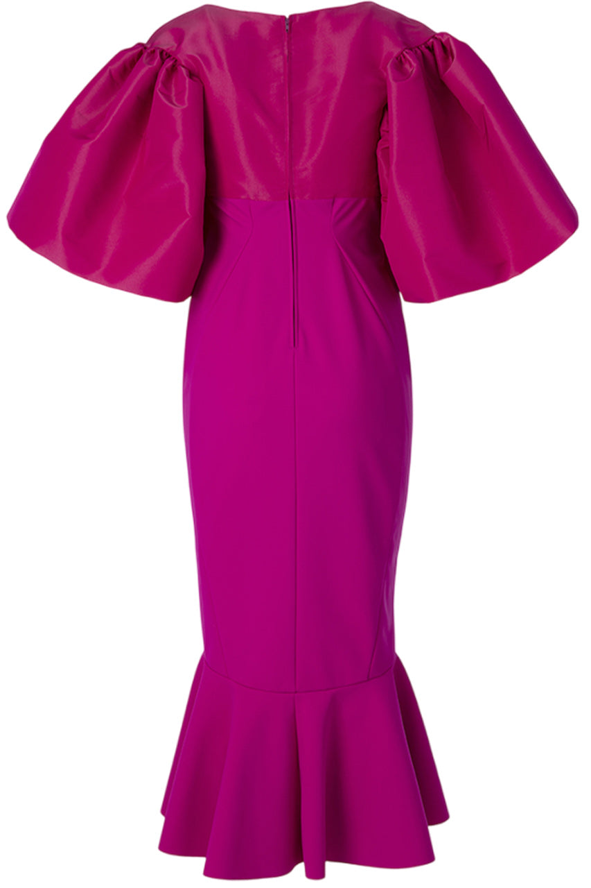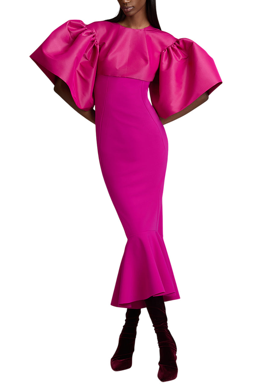 Stand out in this statement dress from Greta Constantine. Designed with a jewel neckline, oversized short sleeves, empire waist and fitted slim skirt with a flared hemline.