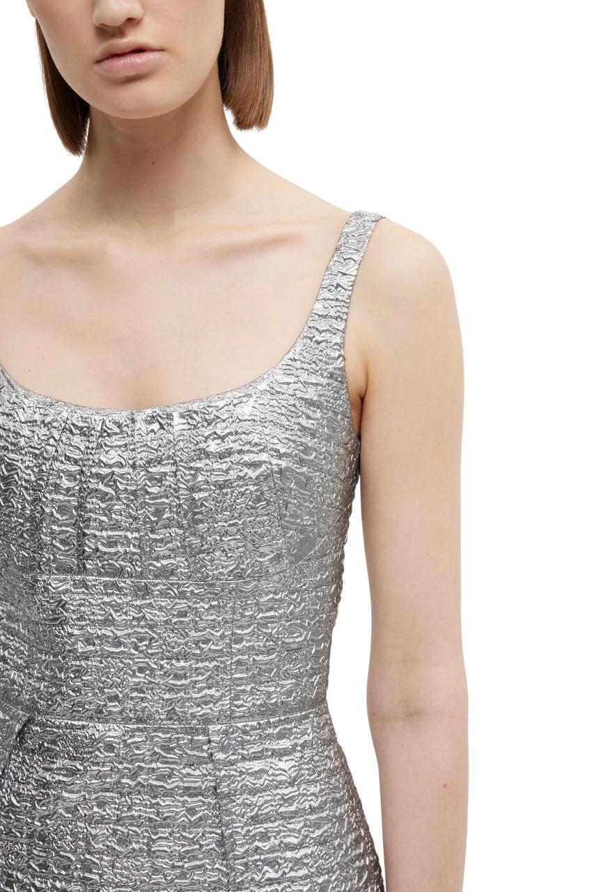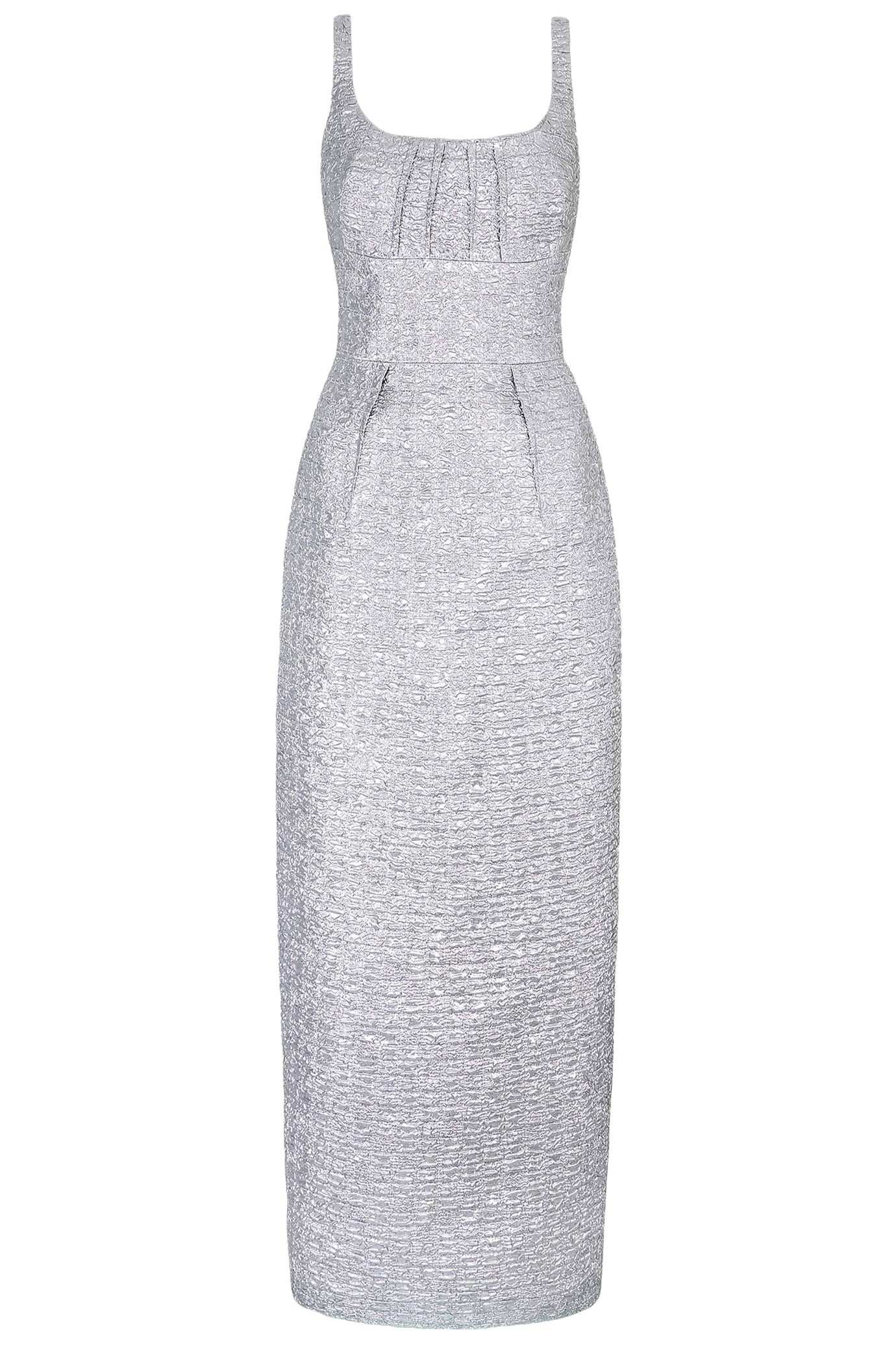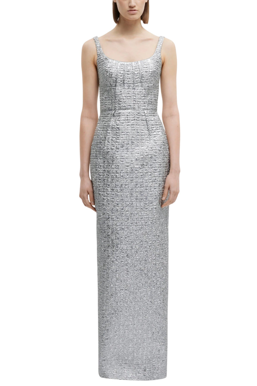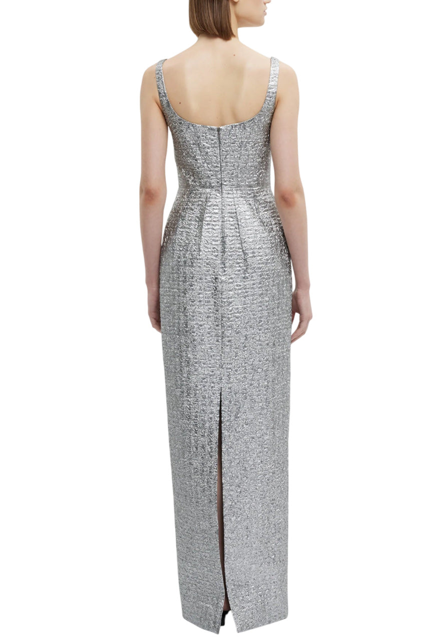 Expertly crafted with architectural influences, the Sharon Dress is a perfect evening option. Made from silver metallic seersucker fabric, it boasts a flattering neckline and inverted darts for a refined and opulent look. The floor-length silhouette is sure to make a statement at any event.