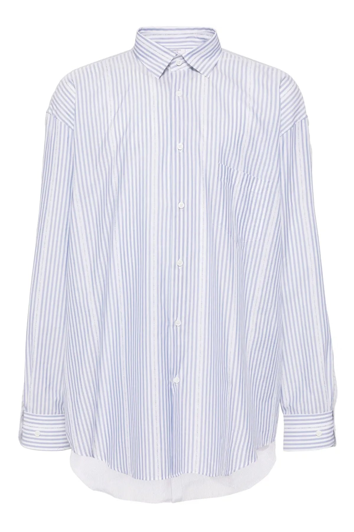 Crafted with a reversible design, this piece features a textured cotton poplin fabric with a striking vertical stripe pattern. A subtle jacquard logo adds a touch of sophistication, complemented by classic collars and button-fastened sleeves. Practical touches include two chest and rear pockets, while buttoned cuffs and a curved hem create a clean, tailored silhouette.
