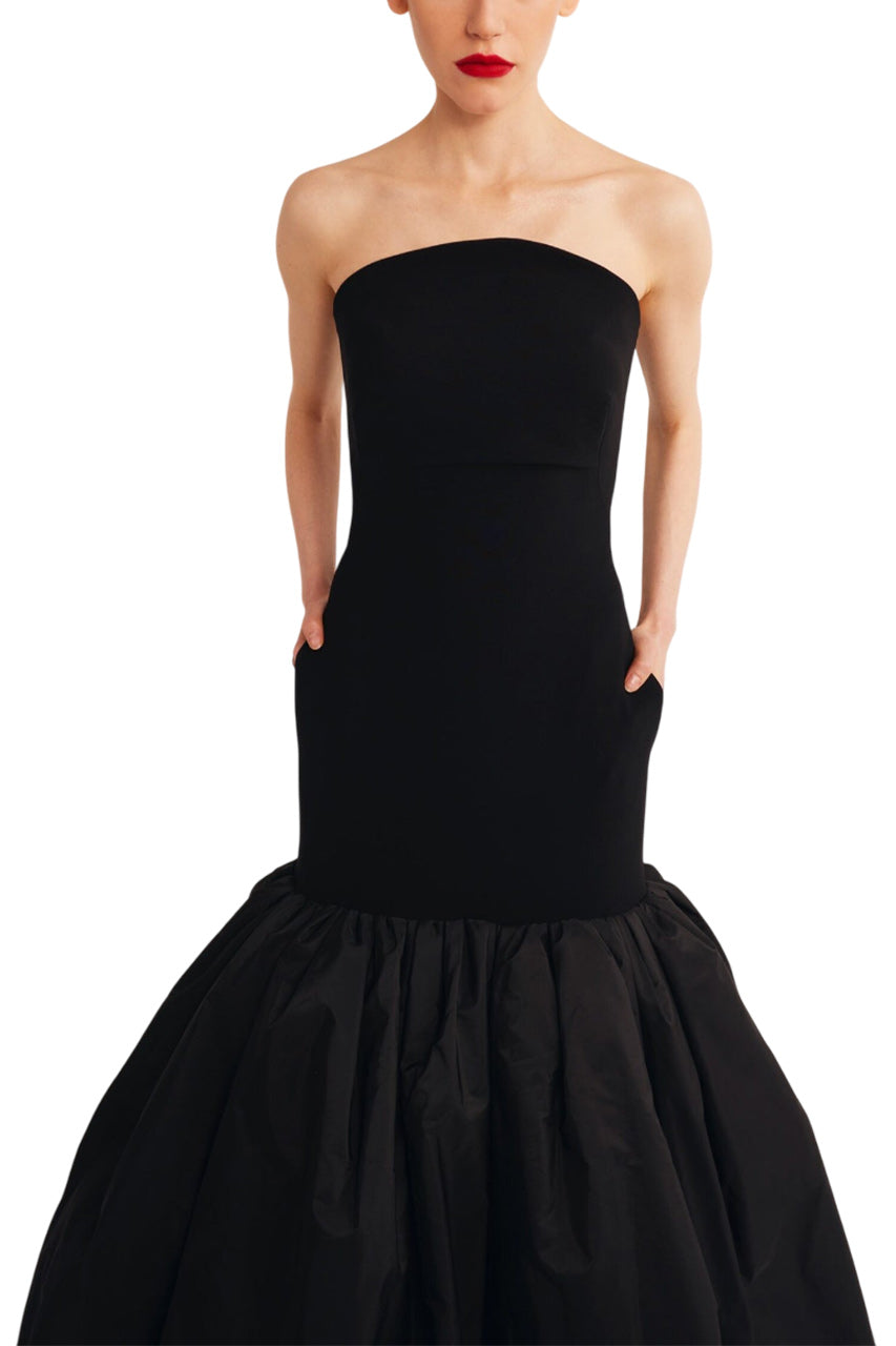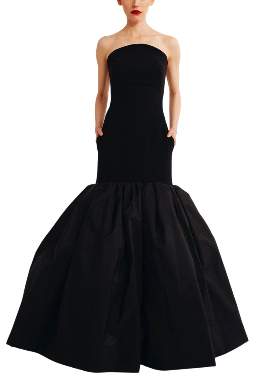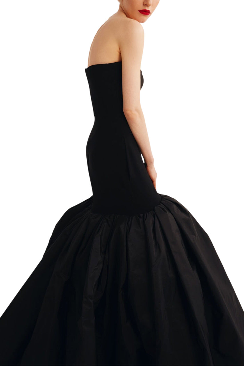 This elegant strapless mermaid dress by Yolancris combines a sleek crepe bodice with a dramatic jet-black taffeta skirt. The mermaid cut accentuates your curves, while the pleated design adds a touch of drama. Perfect for formal events and special occasions.