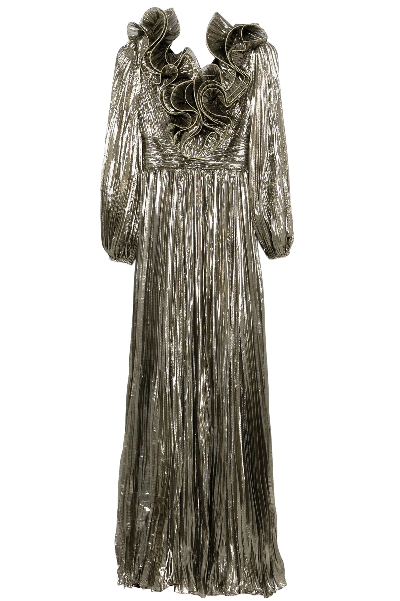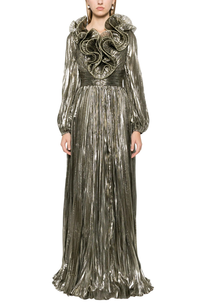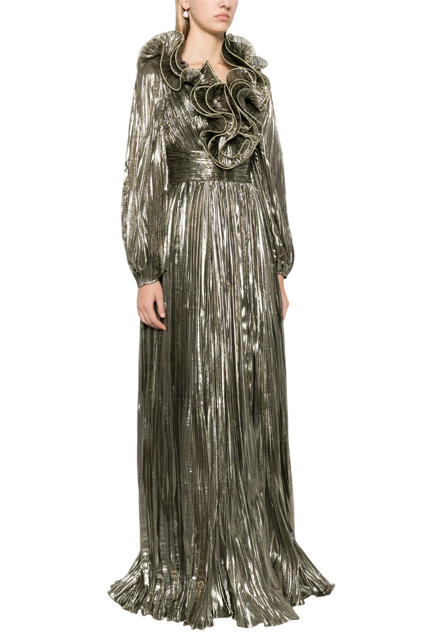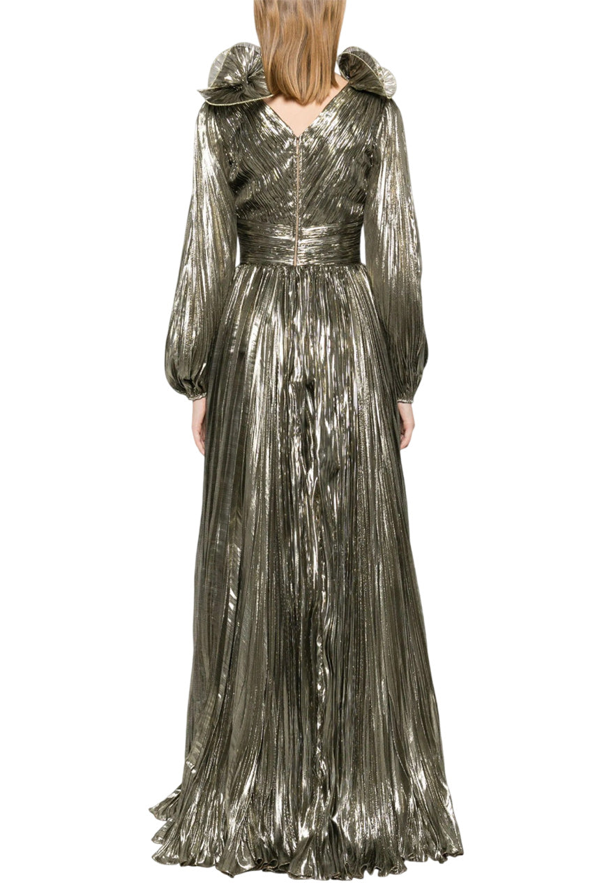 The Penelope Gown exudes sophistication and elegance with its gold-tone silk fabric and intricate details. The plissé effect and 3D detailing at the neckline add texture and dimension, while the V-neck and balloon sleeves create a flattering silhouette. The empire line and floor-length design provide a regal touch, making it perfect for your formal.