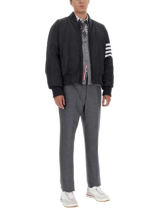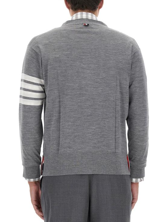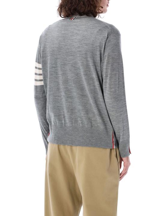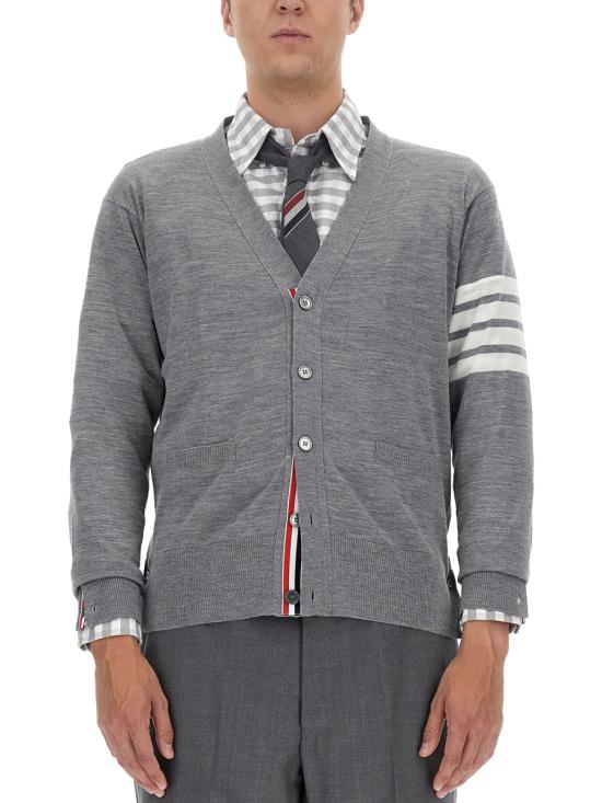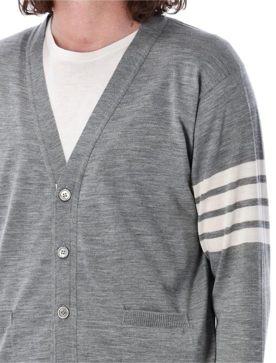 This merino wool cardigan features a button-front closure, a V-neckline, long sleeves with cuffs, and a distinctive '4 bar' detail on the sleeve.