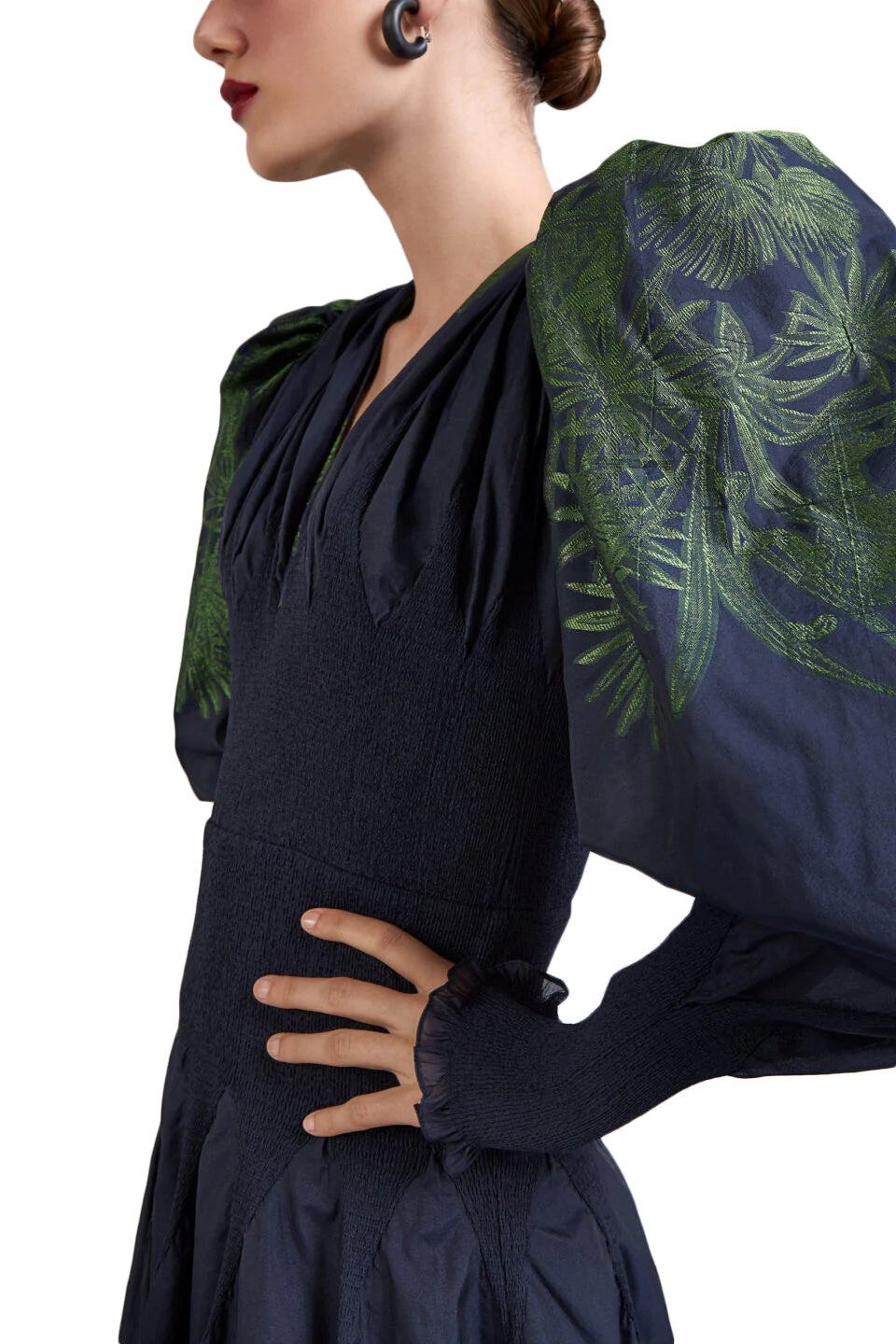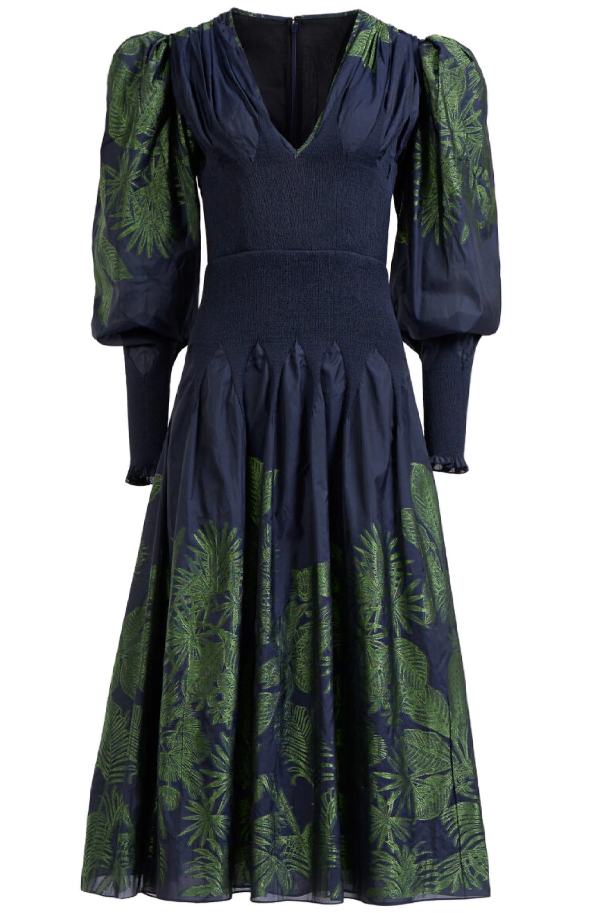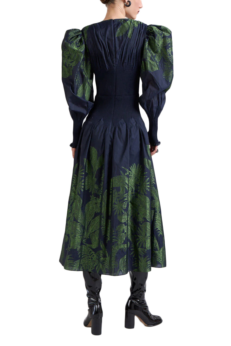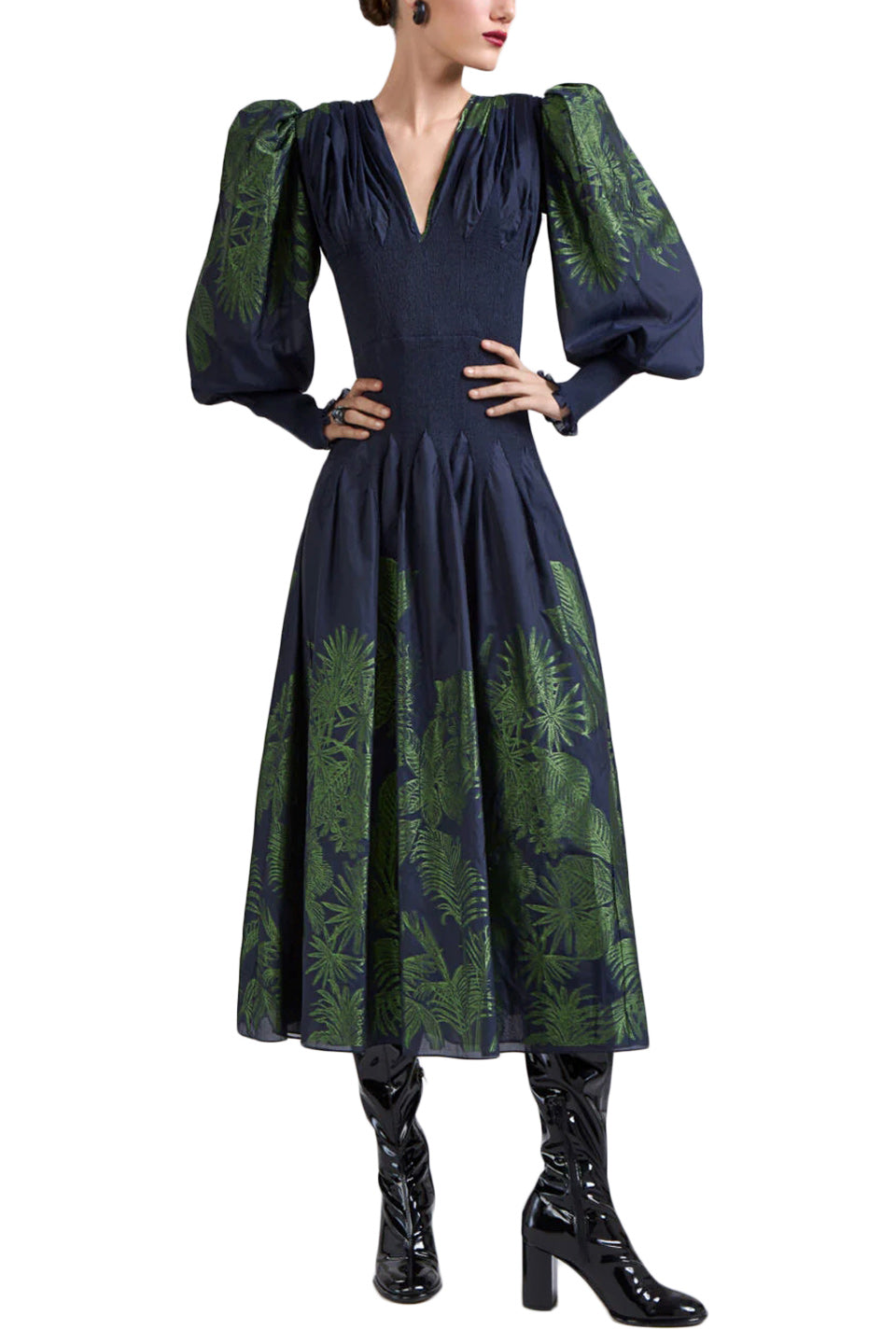 Expertly crafted with voluminous silhouette and a deep V-neckline, the Carolina Jacquard Dress features plissé detail for a flattering fit. The billowy gathered sleeves and floaty skirt are adorned with contrasting tropical leaf embroidery, adding elegance to this midi dress.