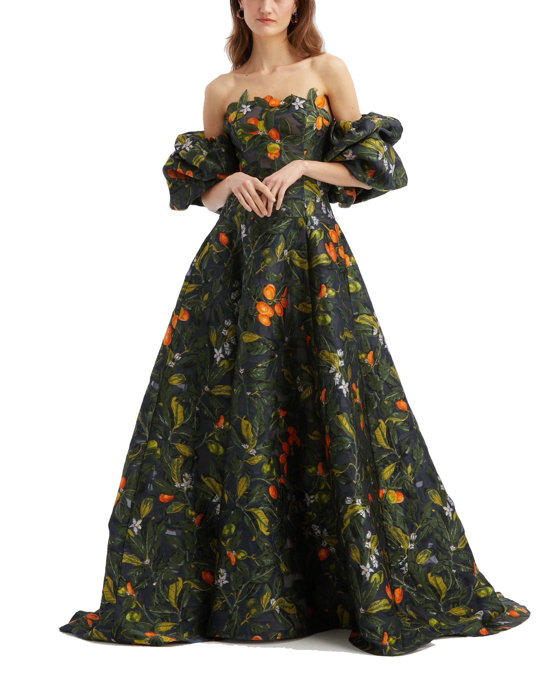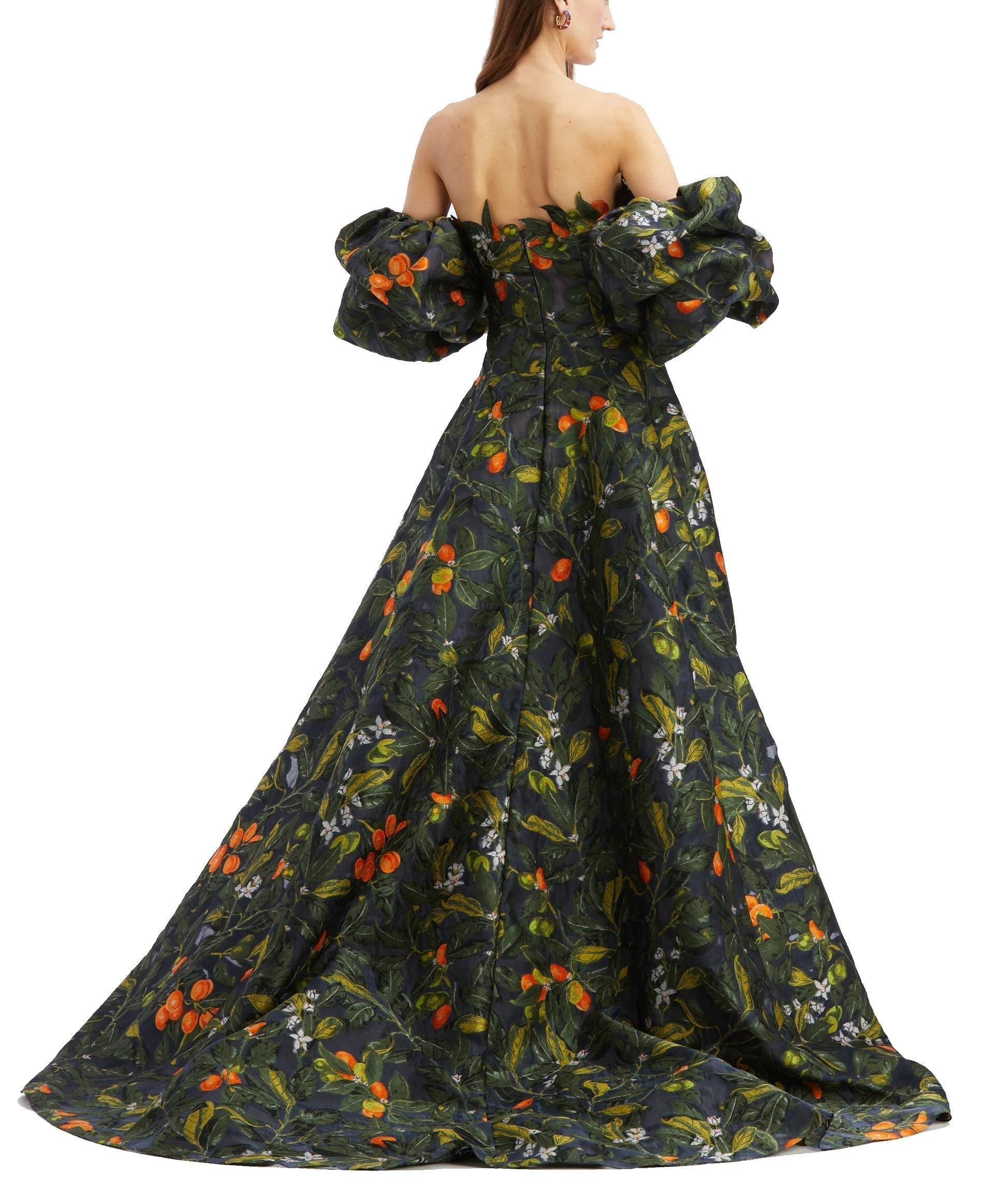 Expertly crafted with dimensional puff sleeves and an off-the-shoulder neckline, the OFF-SHOULDER PUFF GOWN creates a stunning silhouette. The full skirt adds a touch of elegance, making it the perfect choice for any formal event or special occasion. Stand out from the crowd in this exquisite gown.