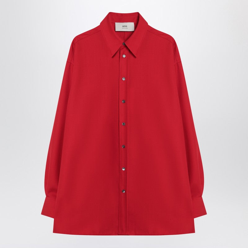 Elevate your wardrobe with the Ami Paris red virgin wool shirt. This classic design features a pointed collar, long sleeves with buttoned cuffs, and a back opening secured by an adjustable strap. Front buttoning adds a touch of sophistication, while the high-quality red wool construction ensures comfort and durability. Perfect for SS25, this timeless piece is made in Poland.
