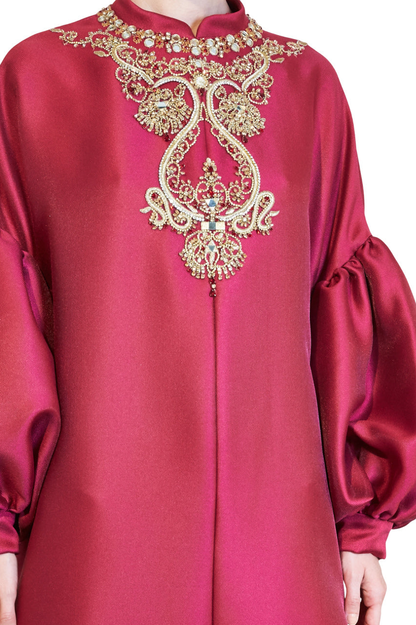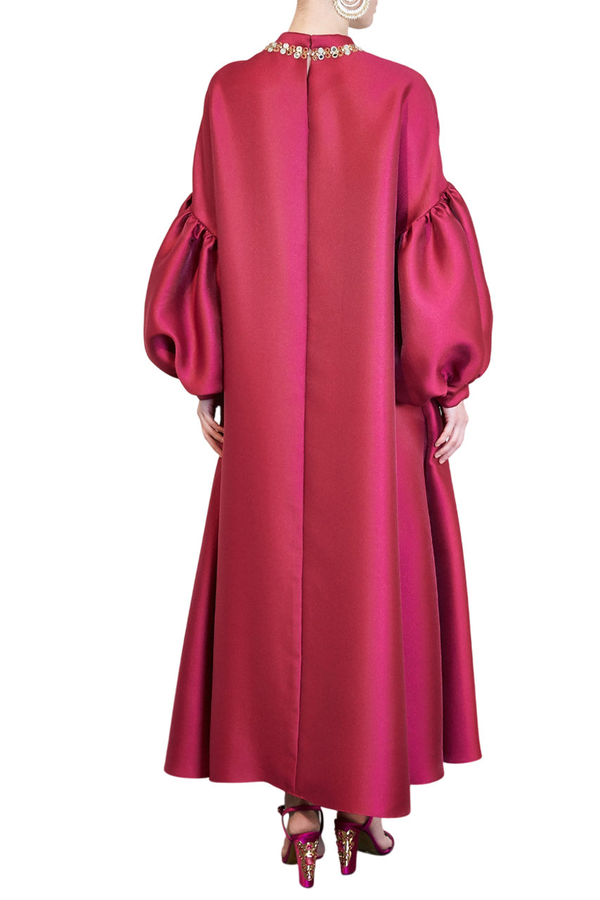 This timeless dress by Reem Acra features an A-line silhouette, rounded mock neckline with embellishments, and bell sleeves.