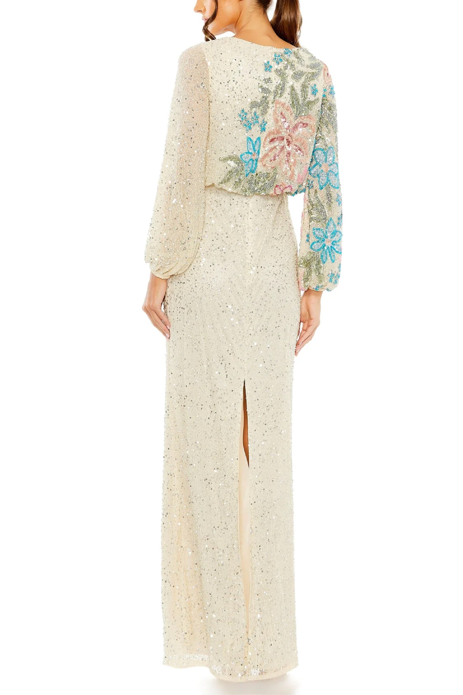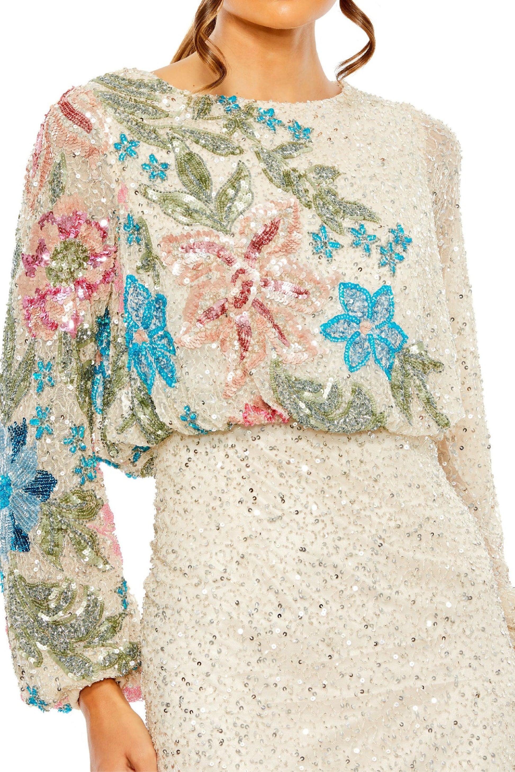 EMBELLISHED MULTI COLOR FLORAL HIGH NECK GOWN