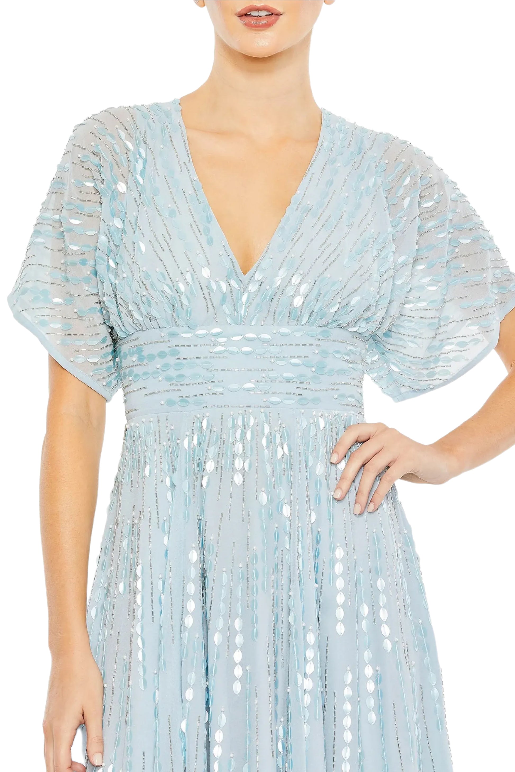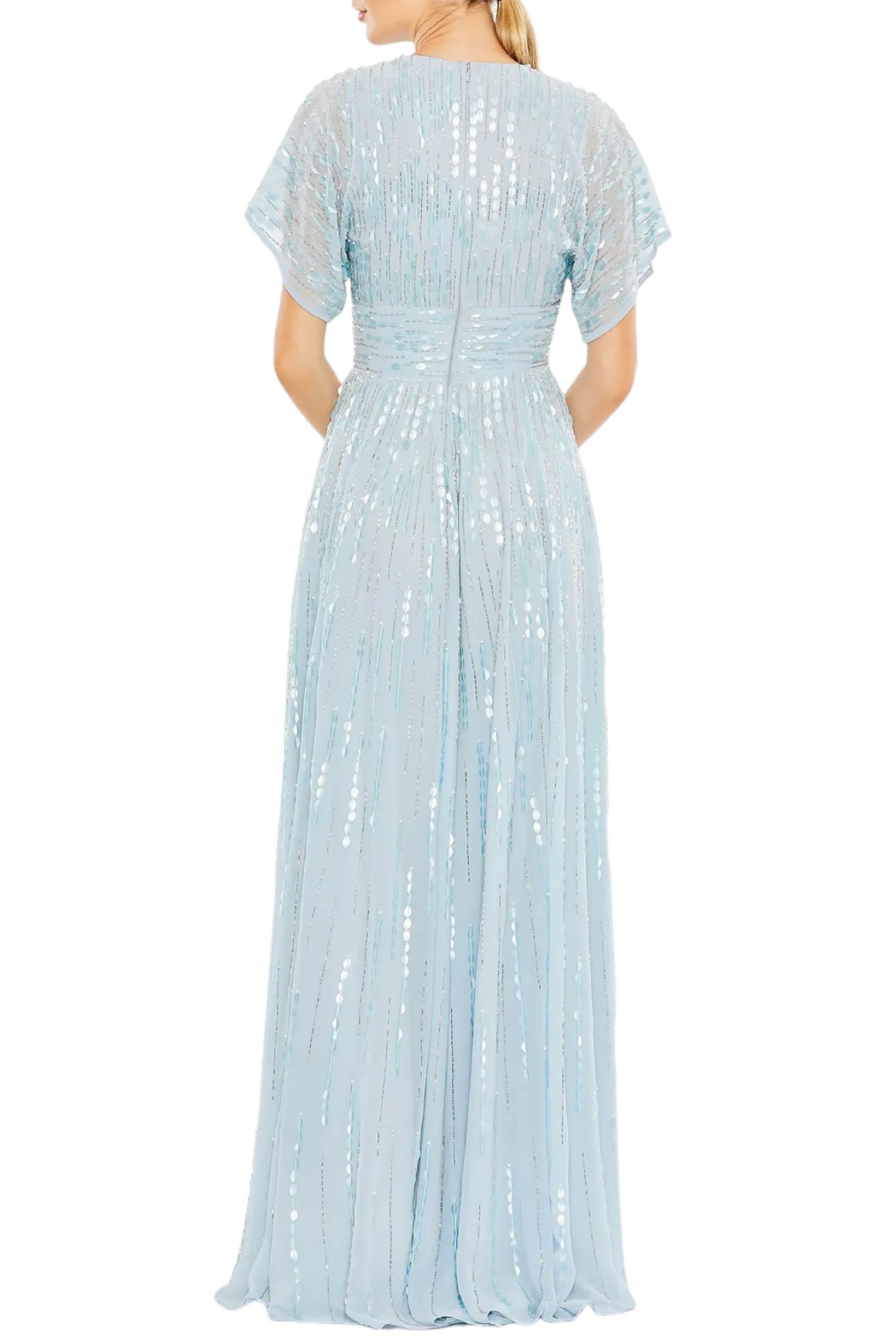This Embellished V Neck Evening Gown is perfect for special occasions. It features a fully lined bodice and skirt, sheer unlined sleeves, a V-neckline, an empire waistline, and a flowy skirt with sequin detailing throughout. A unique, eye-catching style, this beautiful gown will make a statement.