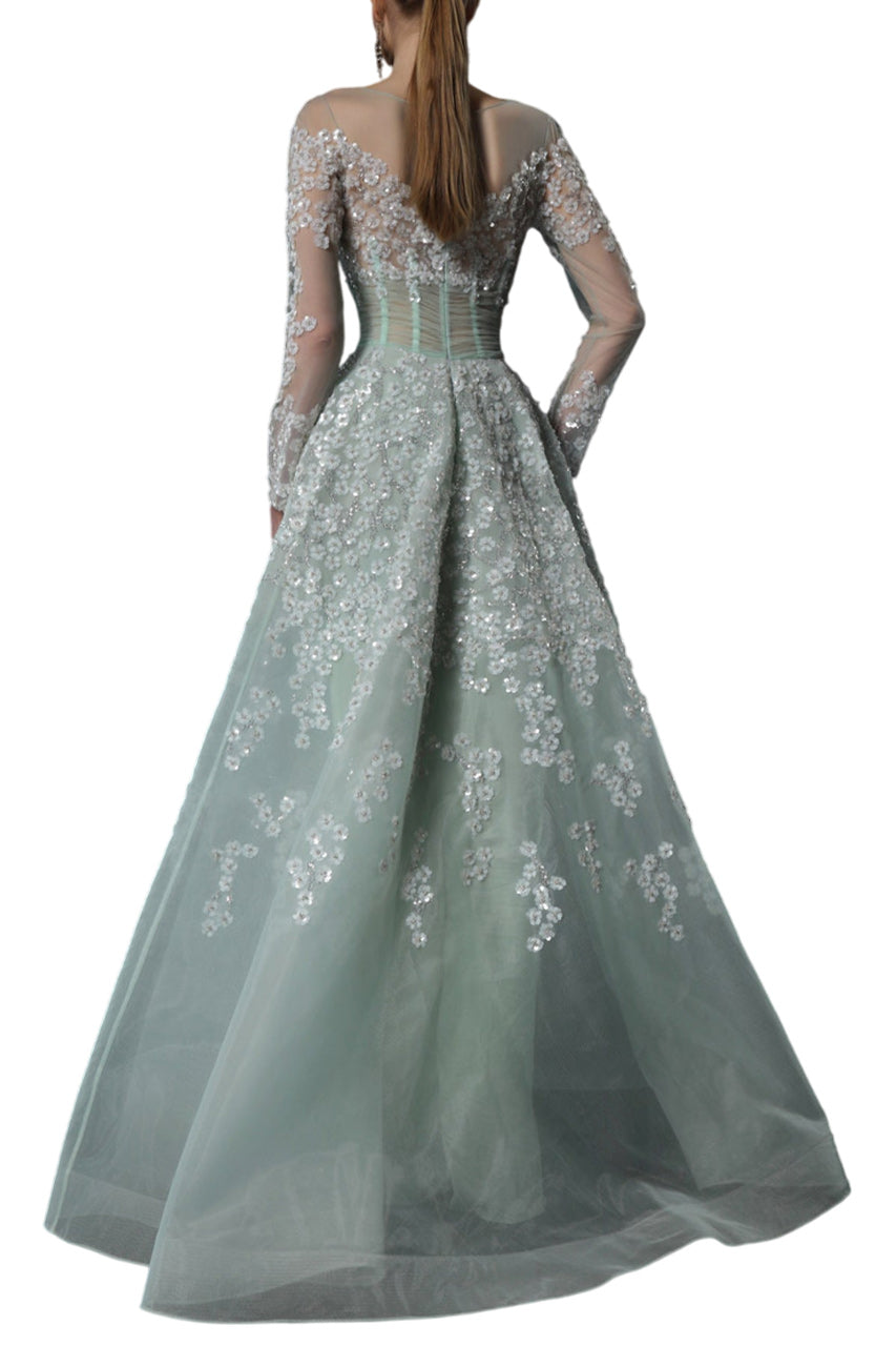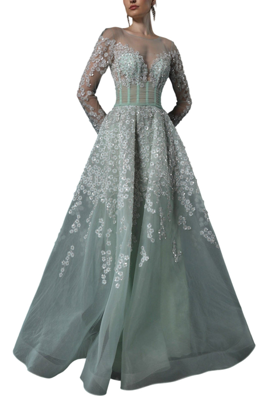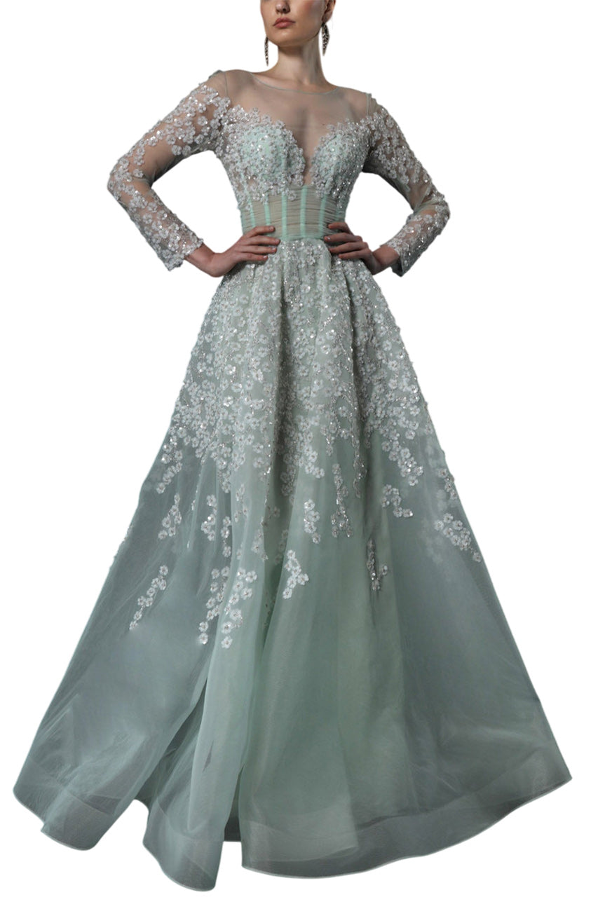 The Enchanted Mist gown is a delicate blend of classic and modern charm. Its soft, hue evokes the beauty of a misty morning, while the intricate floral appliqués and illusion neckline add a touch of magic. With gentle sparkle and sheer lace sleeves, this dress is perfect for a garden wedding or romantic evening celebration.