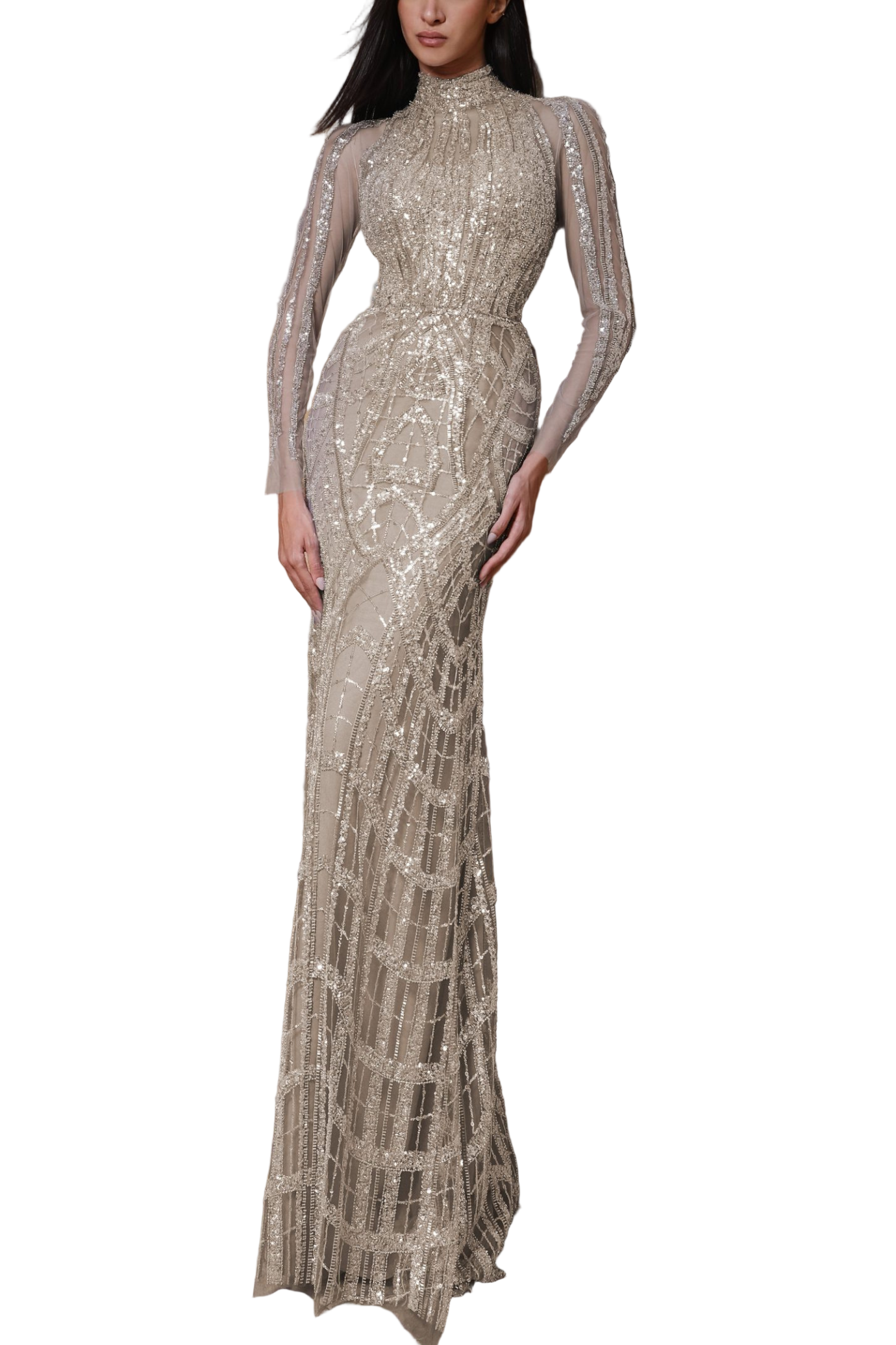 Elegance meets craftsmanship in this stunning strapless gown by AZ Couture. Adorned with intricate beading in a diamond pattern and a flattering structured silhouette, this gown is designed to dazzle at any formal occasion. Now available online and in-store at Al Boushiya.