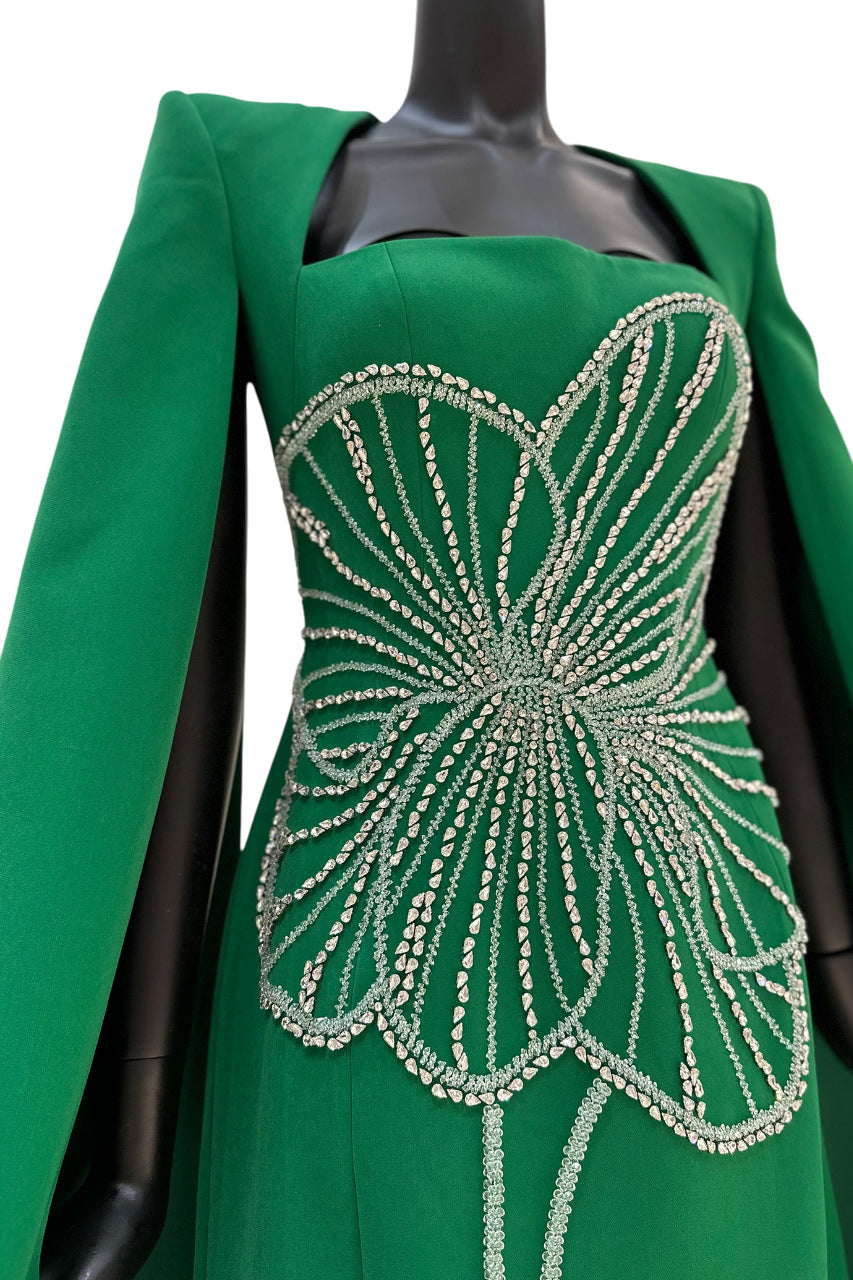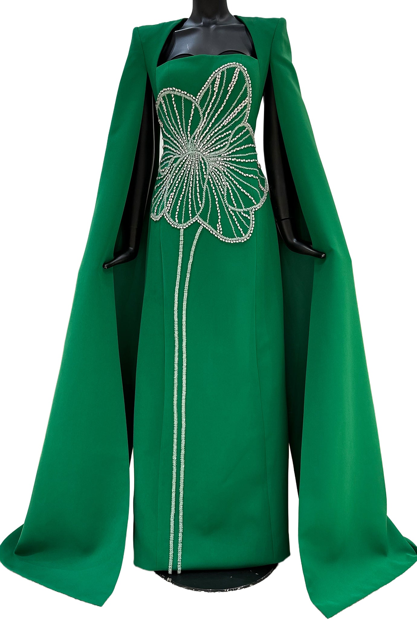 Stunning, elegant black gown designed with a sophisticated and dramatic flair. Form fitting silhouette.
