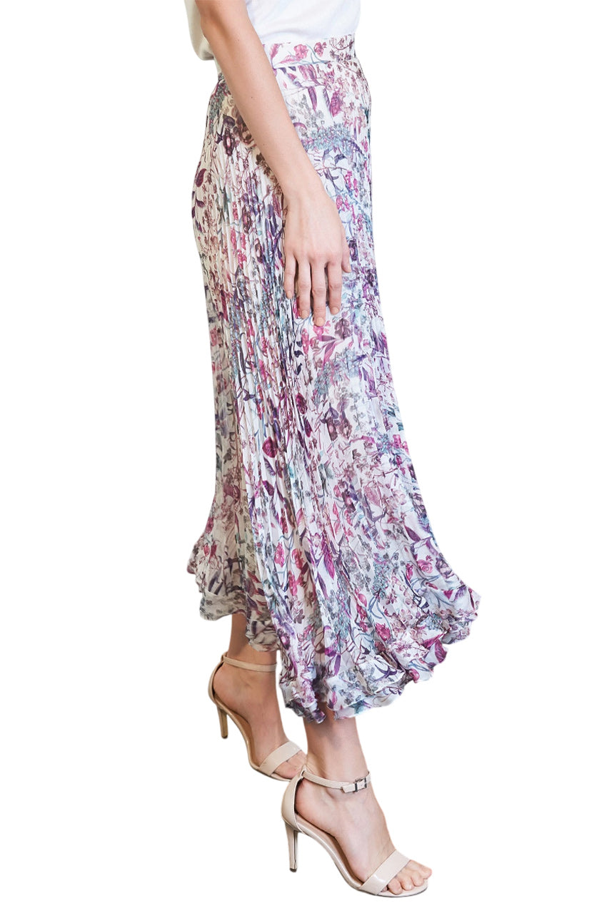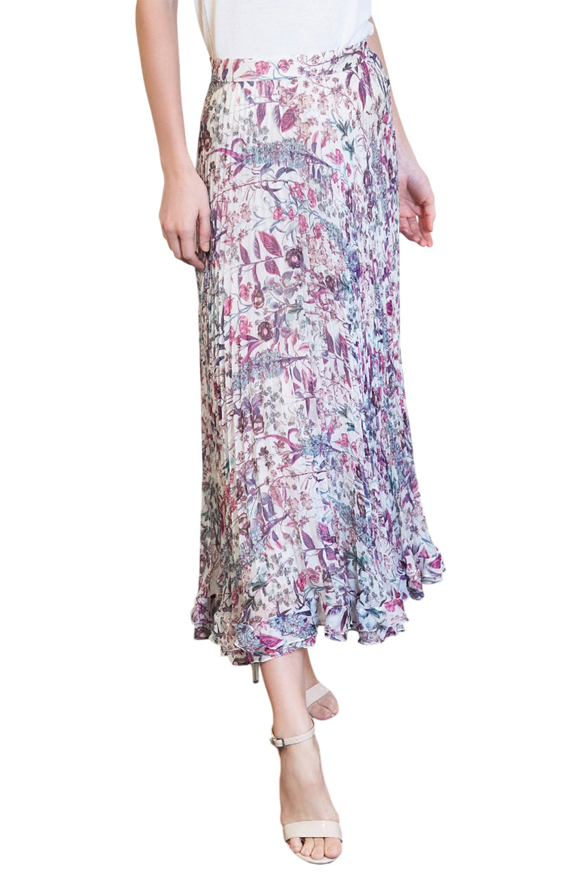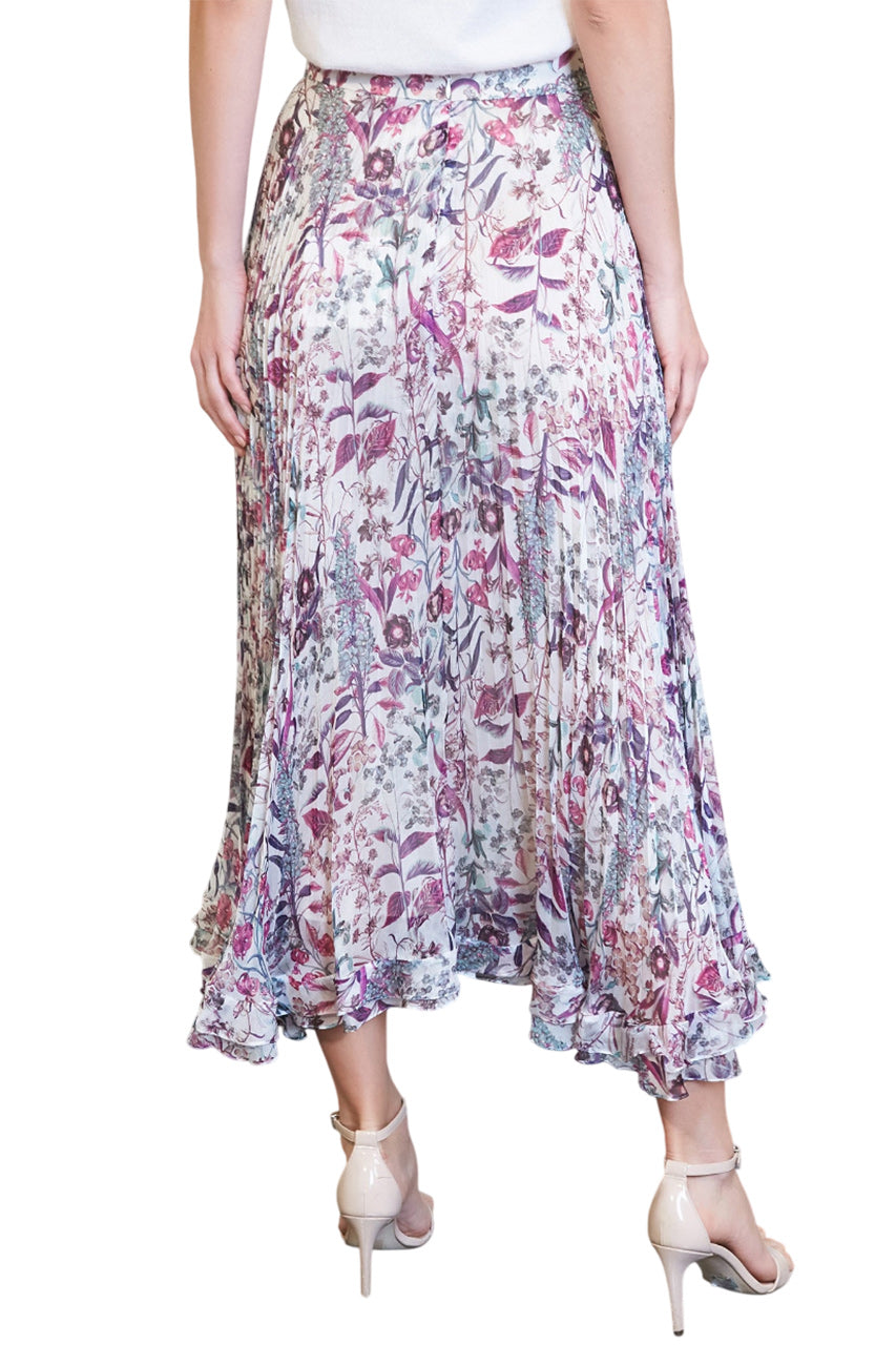 Floral printed silk pleated skirt with a ruffle detailed hem.