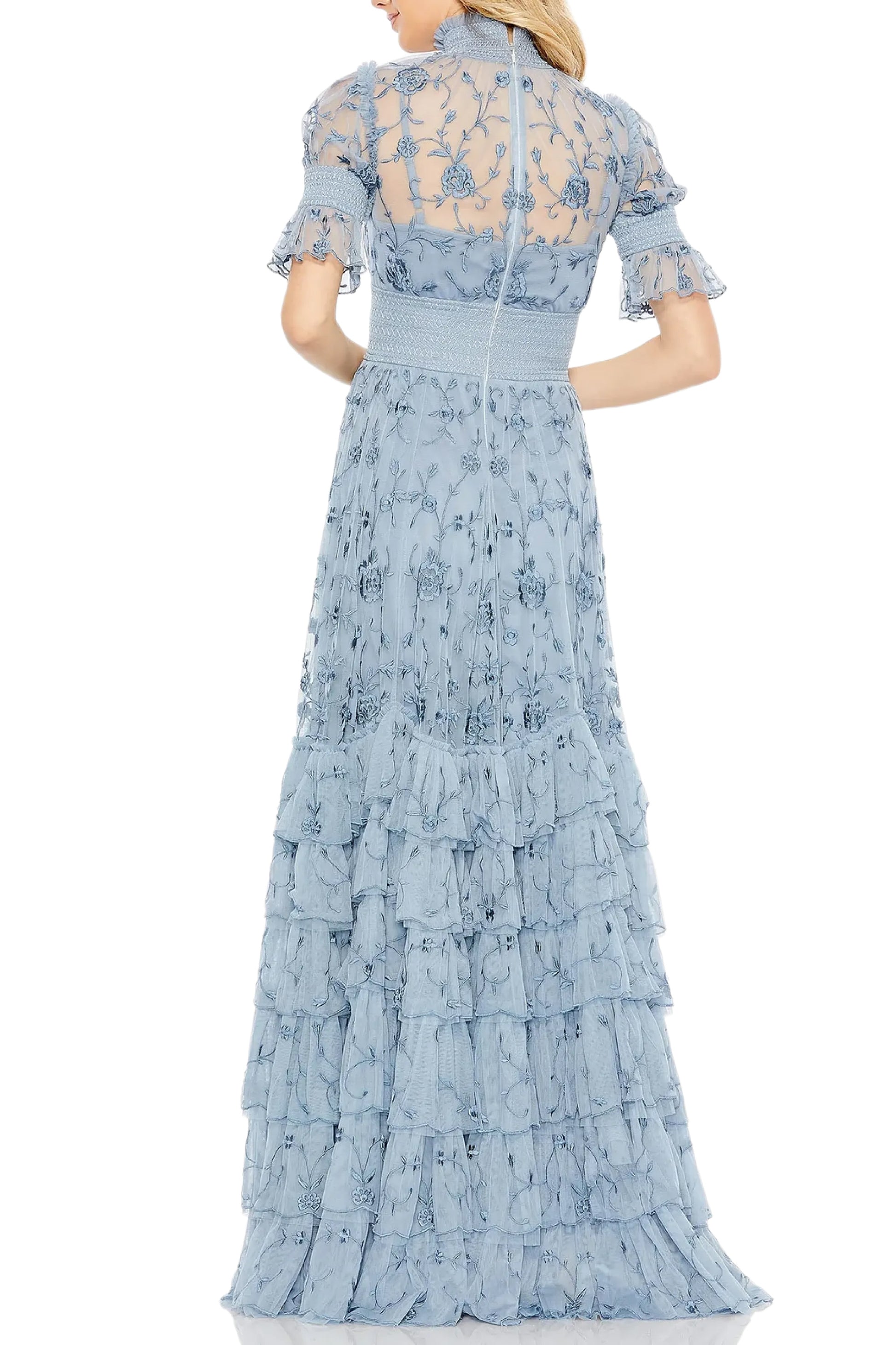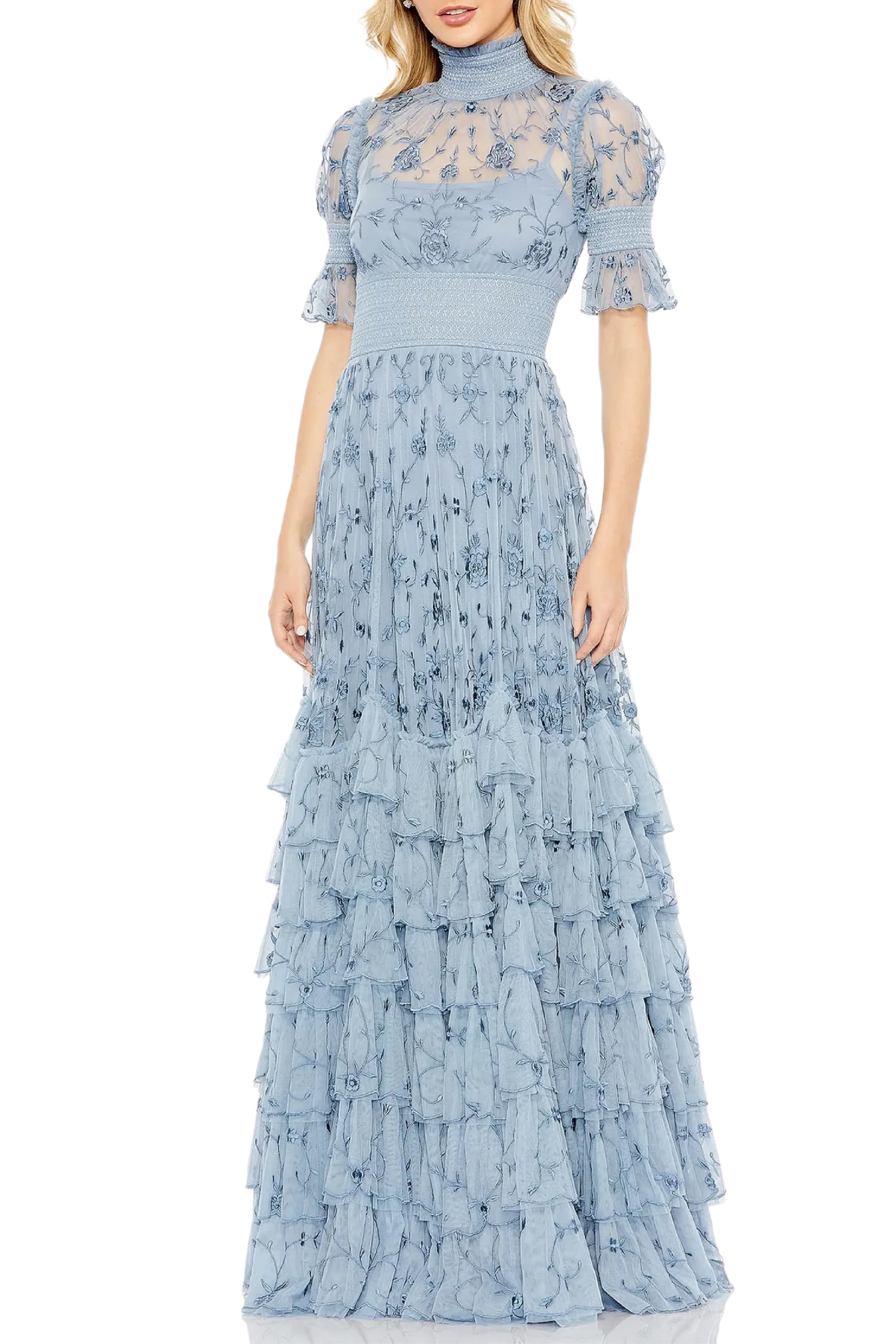 This exquisite Floral Tiered Smock Neck Gown is perfect for elegant occasions. Crafted with a partially lined bodice, fully lined skirt, and sheer unlined sleeves, it is a beautiful combination of comfort and luxury. The smock neckline is complemented by illusion ruffle cuffed short sleeves and an eye-catching lace-accented ruffle tiered skirt detailed with floral and lattice designs.