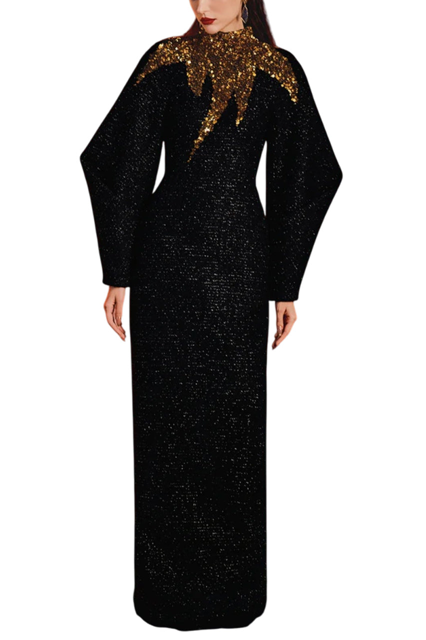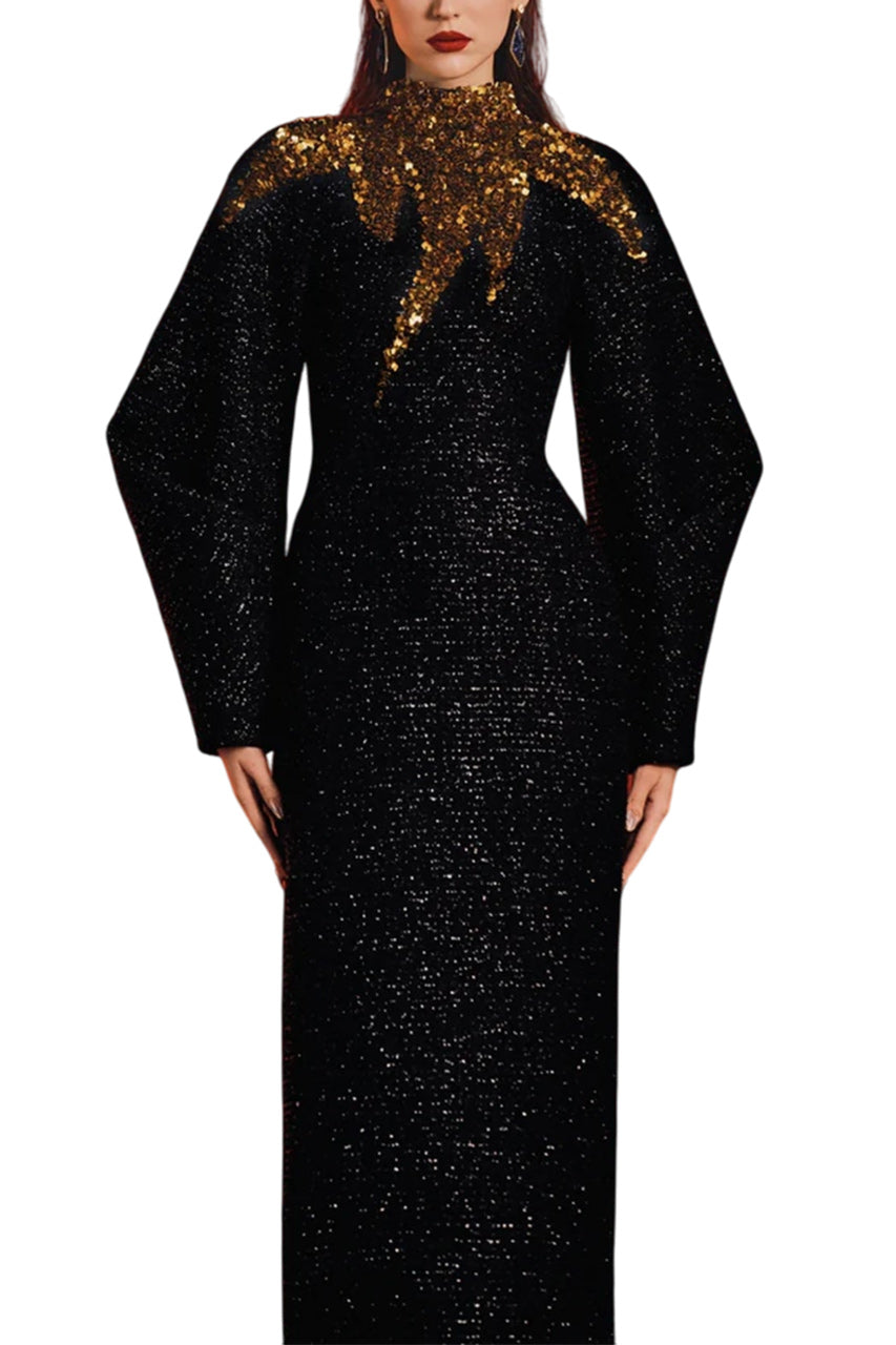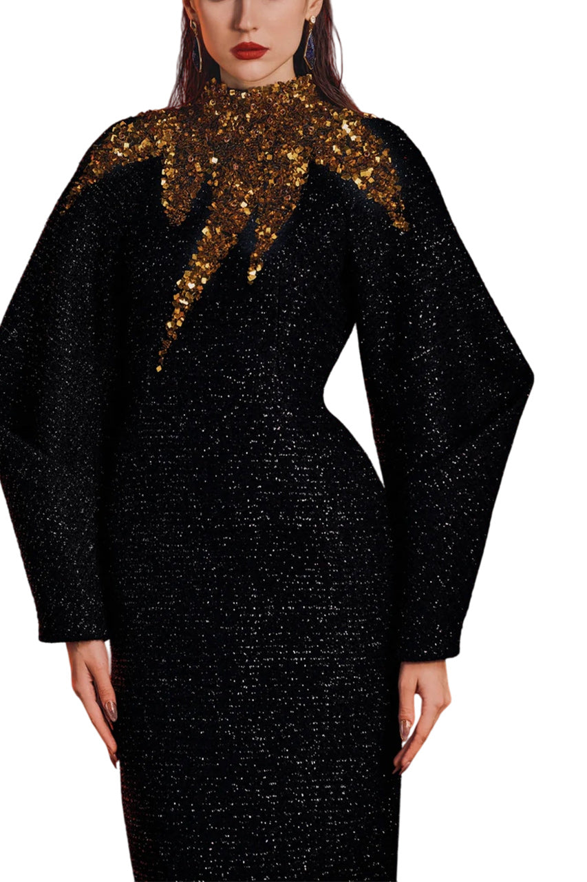 Get ready to dazzle in our High Neck Fluffy Sleeve Dress. Made from sparkling tweed and lined with luxurious silk, this dress features a high neck and golden sequin embellishments. The fluffy sleeves and back slit add a touch of elegance, while the straight skirt form flatters every figure. Zipper at the back for easy wear. Perfect for your special occasion.