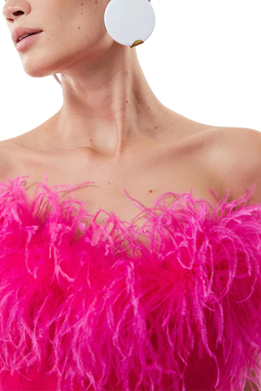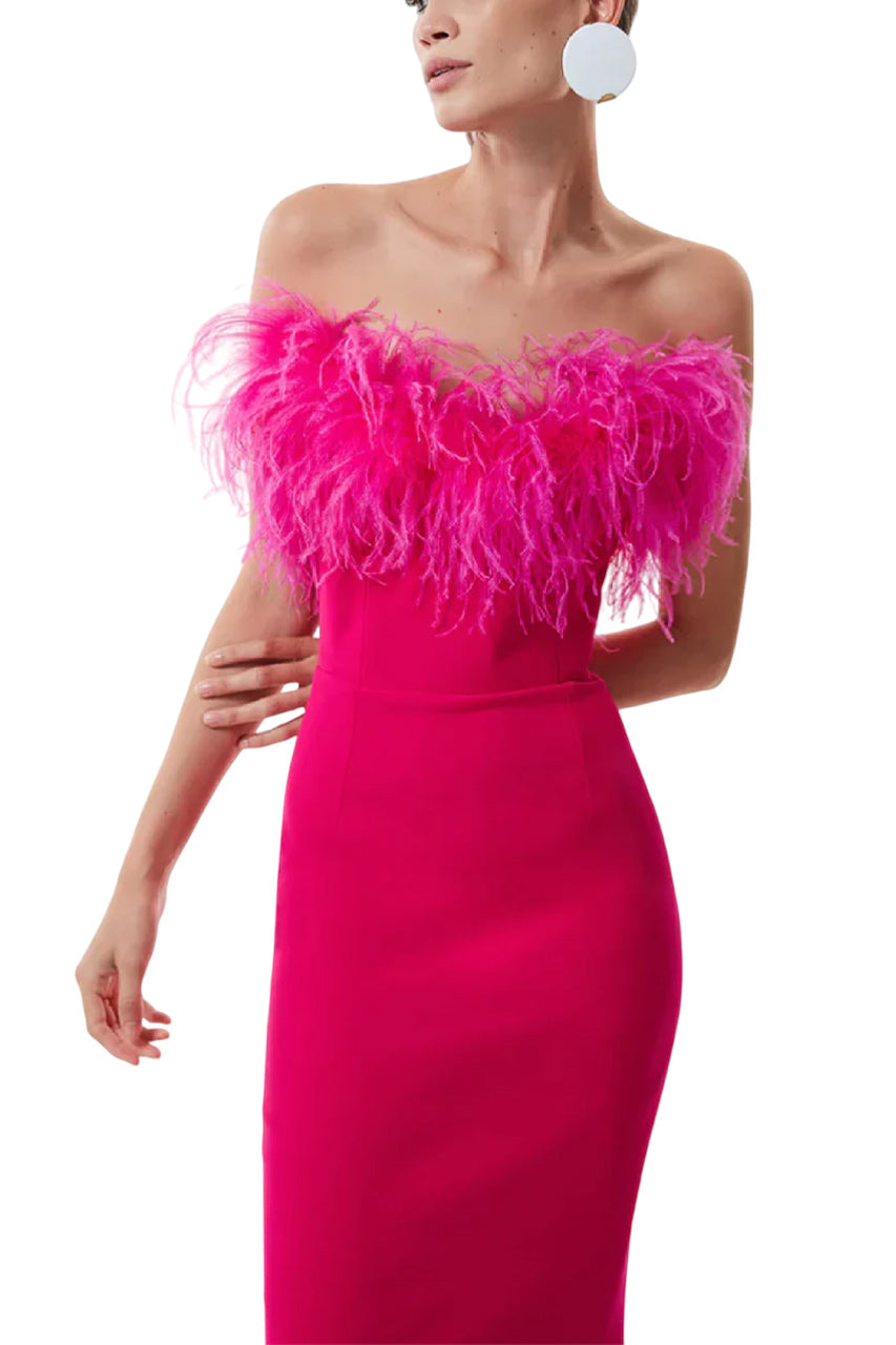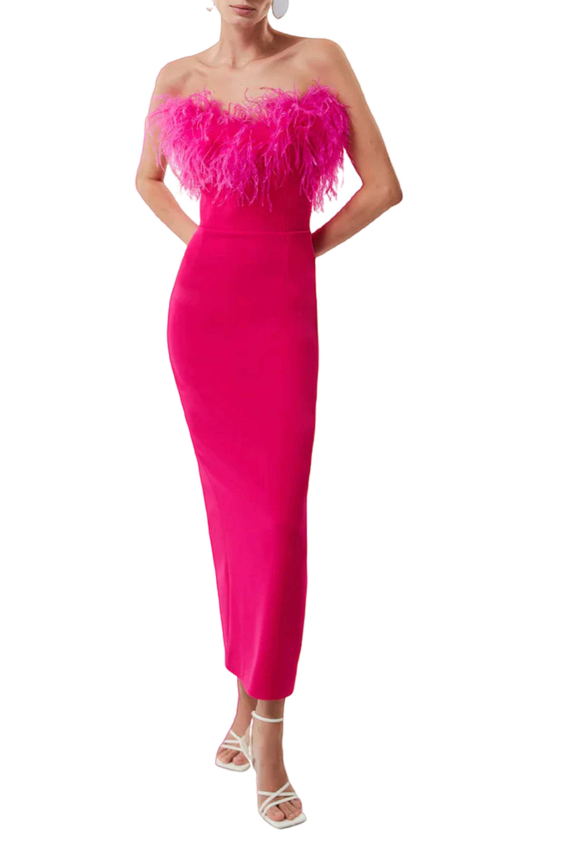 A slim fitting, strapless dress featuring a feather trim and maxi length. Style yours with platform pumps.