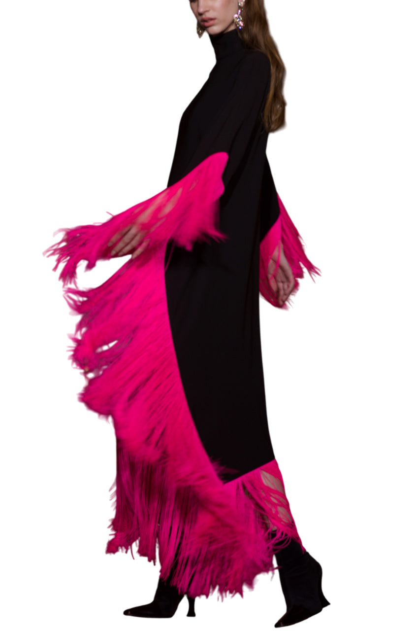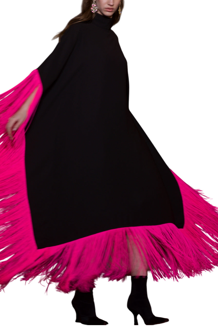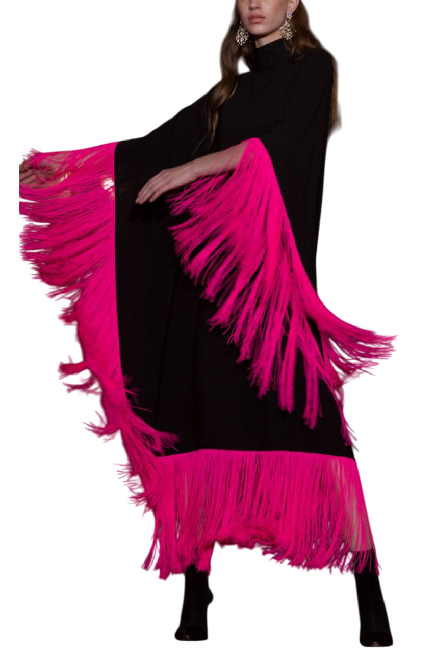 The perfect caftan with a brown and fuchsia color combination. The Maya dress has high neckline complemented by flowing fuchsia tassels to make a statement.