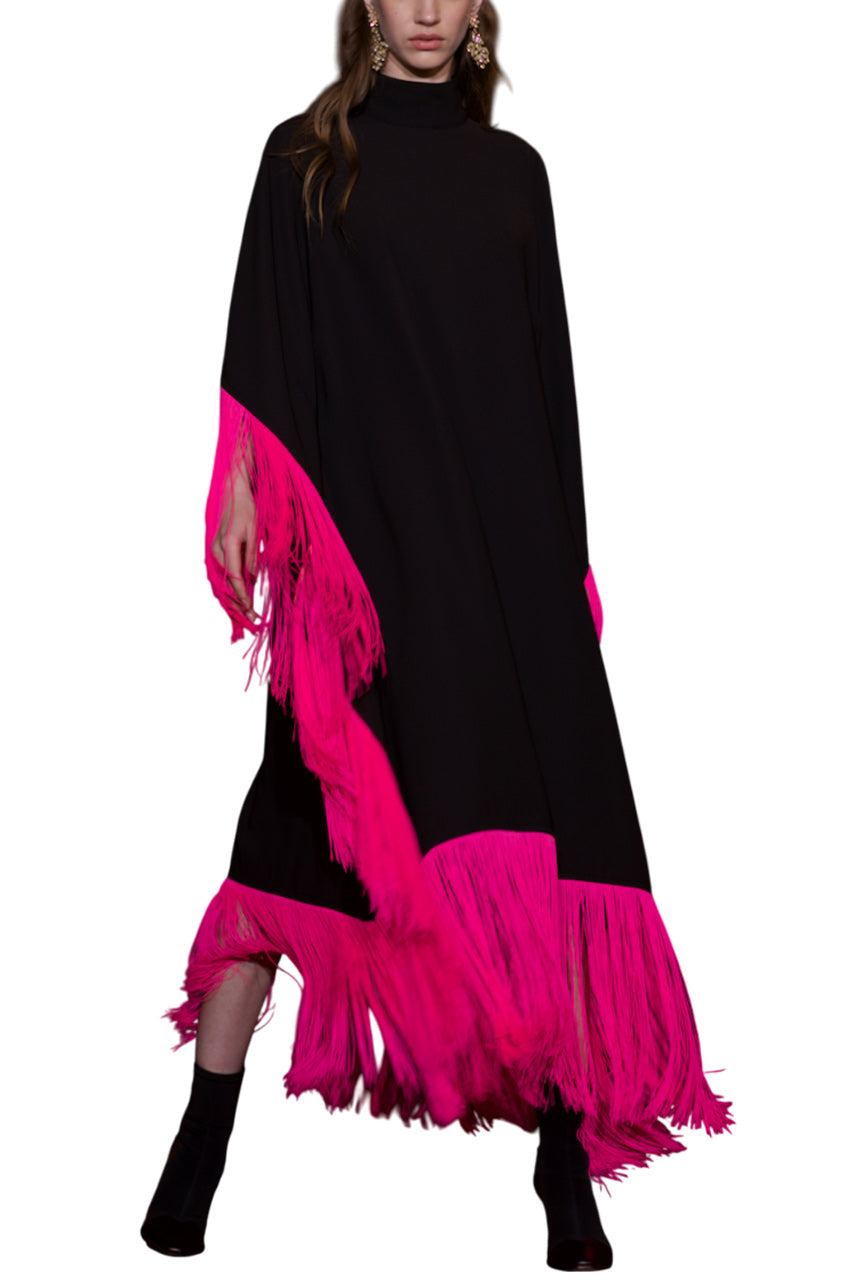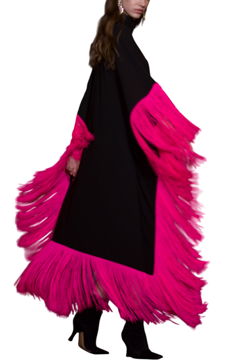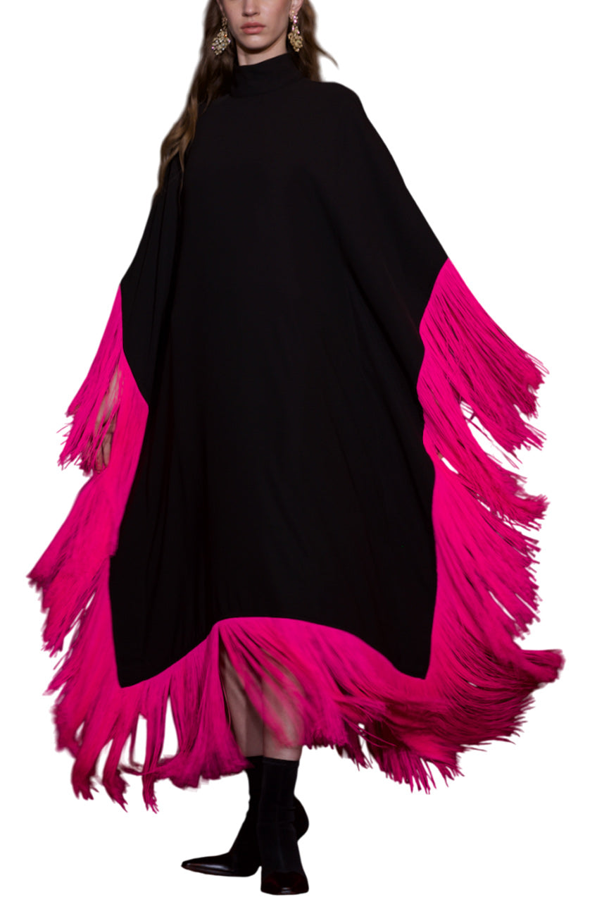The perfect caftan with a brown and fuchsia color combination. The Maya dress has high neckline complemented by flowing fuchsia tassels to make a statement.