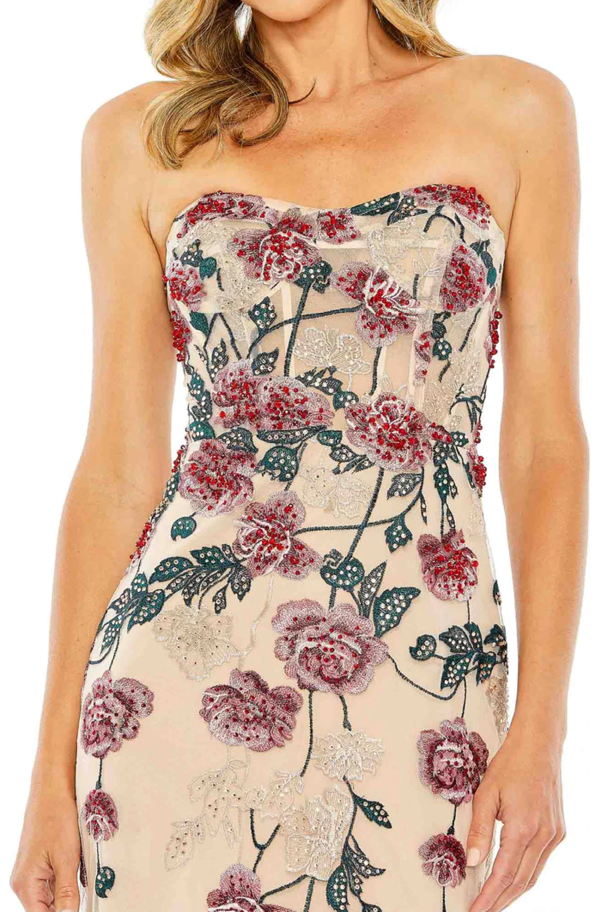 This elegant multicolored Floral-Embossed Strapless Long Gown by Mac Duggal features a stunning floral design that will make you stand out at any event. Its strapless design adds a touch of sophistication, while the floral pattern offers a romantic and feminine look. Perfect for any special occasion.