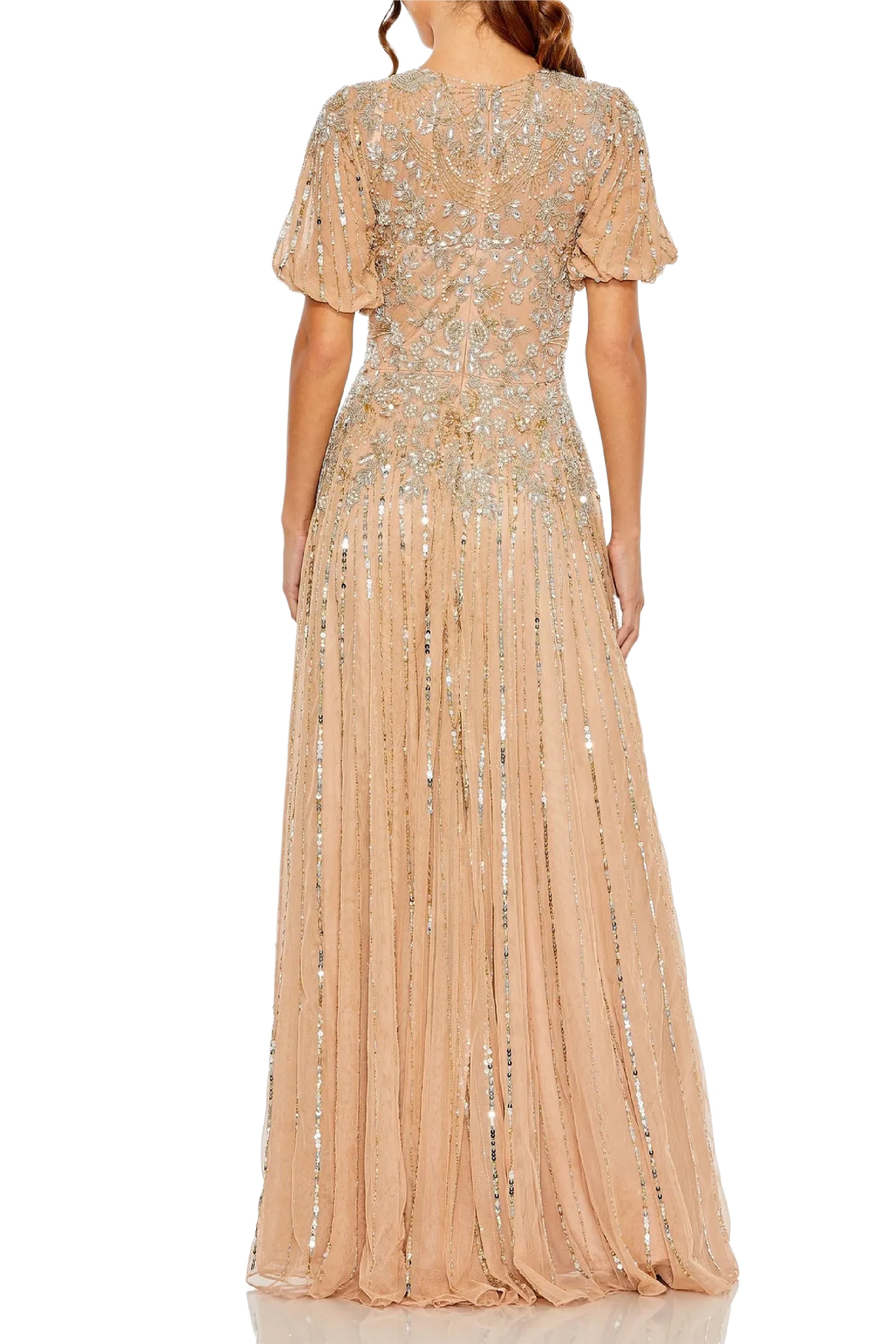 This taupe high neck gown features a unique design with puff sleeves adorned with subtle floral beading and shimmering striped sequin for a hint of sparkle. Perfect for special occasions, this sophisticated piece is sure to make a statement.