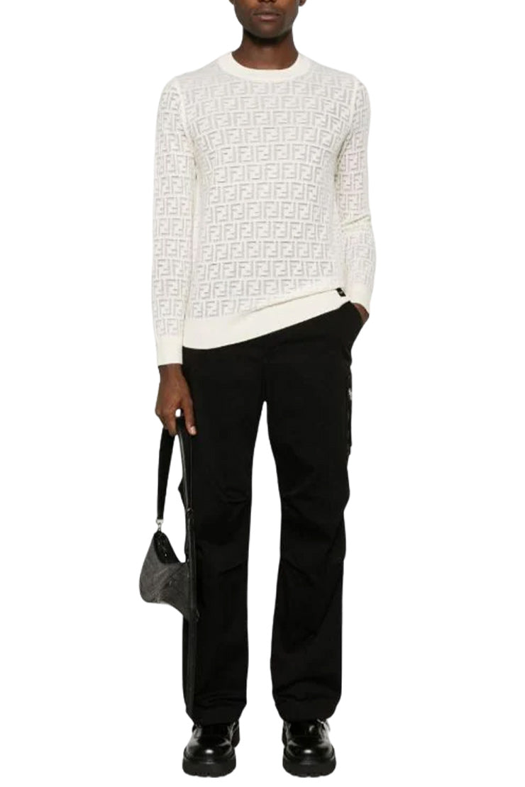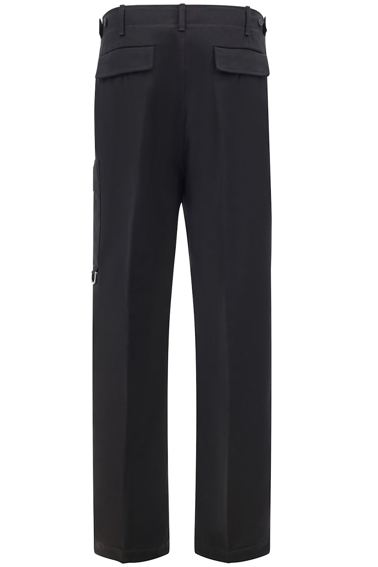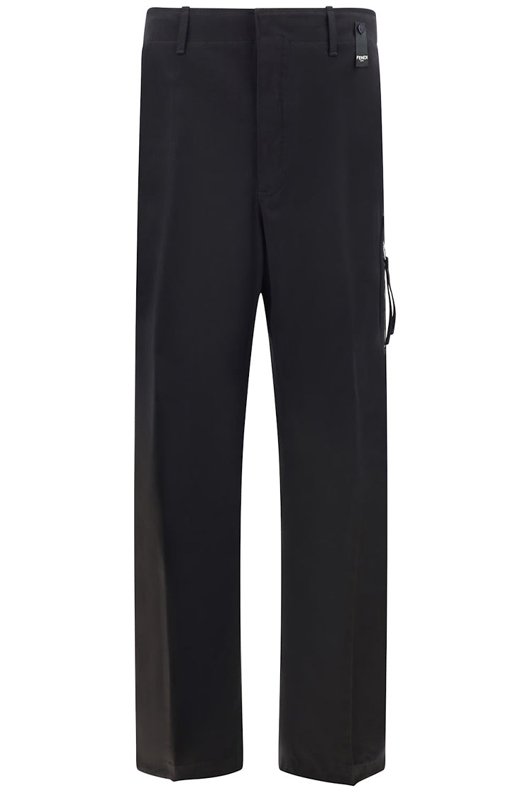 These trousers are crafted from premium black cotton gabardine, boasting a streamlined design with functional details. Side pockets and welt pockets with flaps provide convenience, while a concealed zip closure and adjustable side straps ensure a secure fit. The stretch hem and 24 cm width at the hem offer flexibility, while a patch pocket on the leg features a custom Fendi label and palladium-finish metal accents.