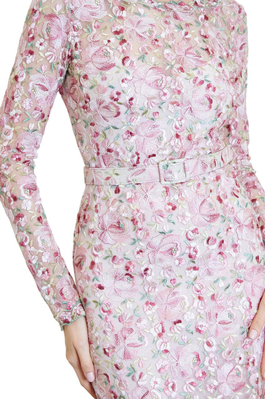 Luisa Beccaria's Tulle Embroidered Sheath Maxi Dress features an elegant high neckline, flattering V-cut back, and fitted silhouette for a timelessly sophisticated look. Crafted with all-over floral thread-work embroidery, this stunning piece adds a touch of elegance to any special occasion.