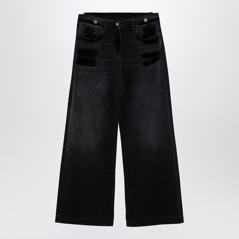 Crafted from rugged black-washed cotton denim, these jeans boast a clean front zip closure with distinctive logo buttons and a classic five-pocket design. Additional details include functional belt loops and a discreet logo patch on the back, elevating a timeless silhouette.