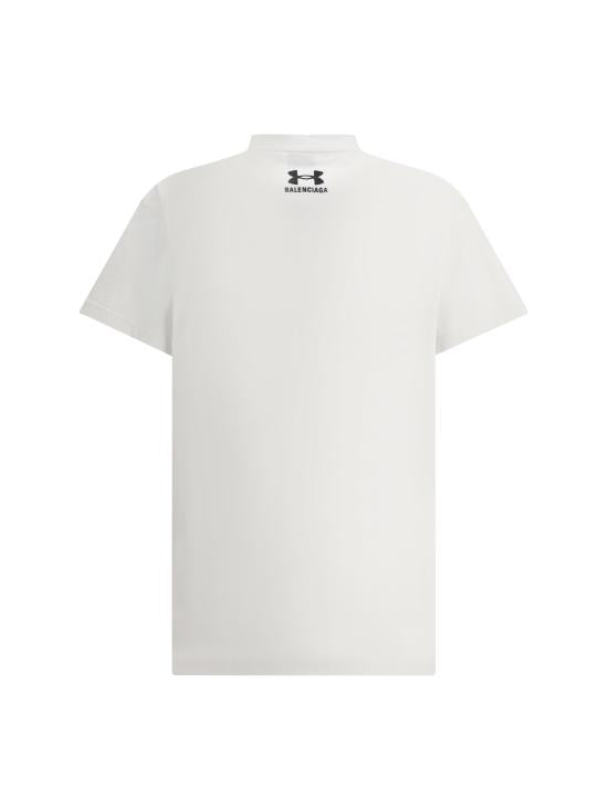 This Balenciaga White Under Armour T-Shirt features vintage white cotton with a worn-in look, a classic crew neckline, and short sleeves. It showcases the Under Armour logo embroidered on both the front and back, designed with an oversized silhouette for a relaxed, contemporary fit.