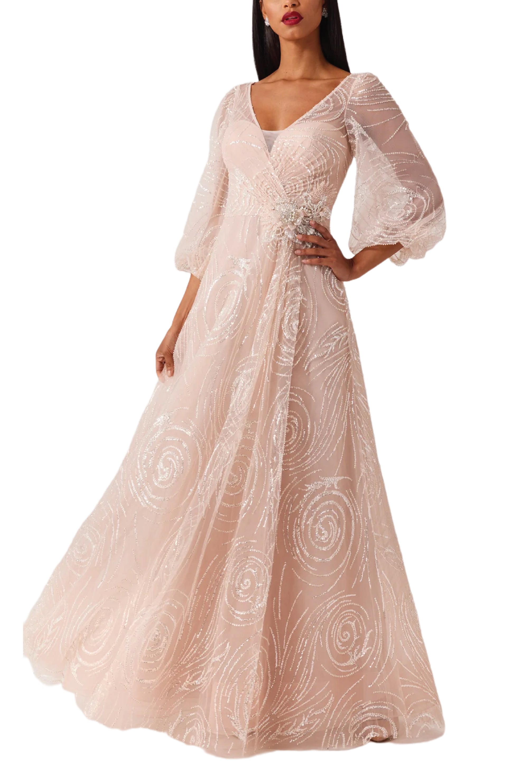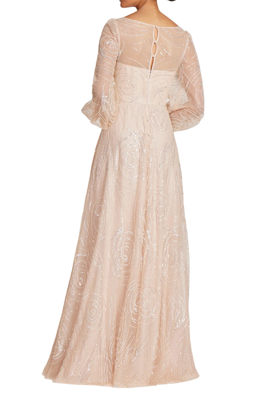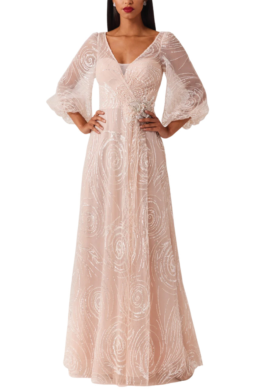 BEADED TULLE V NECK FULL SLEEVE GOWN
