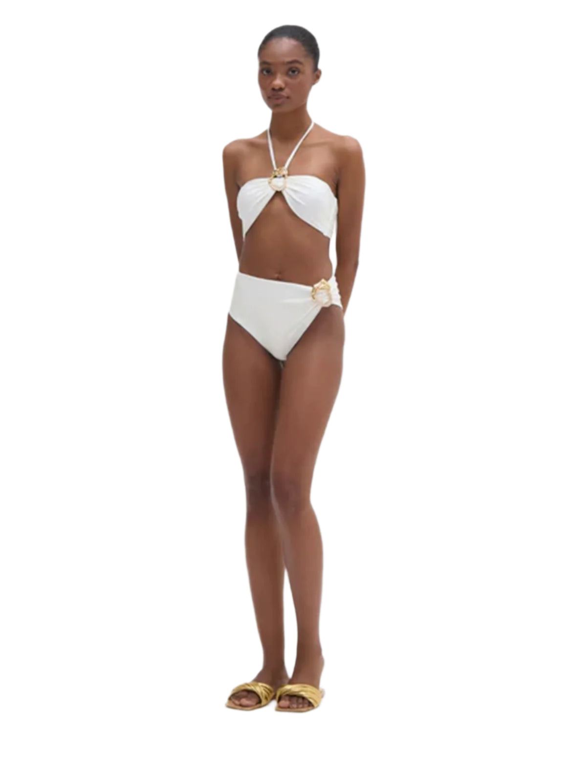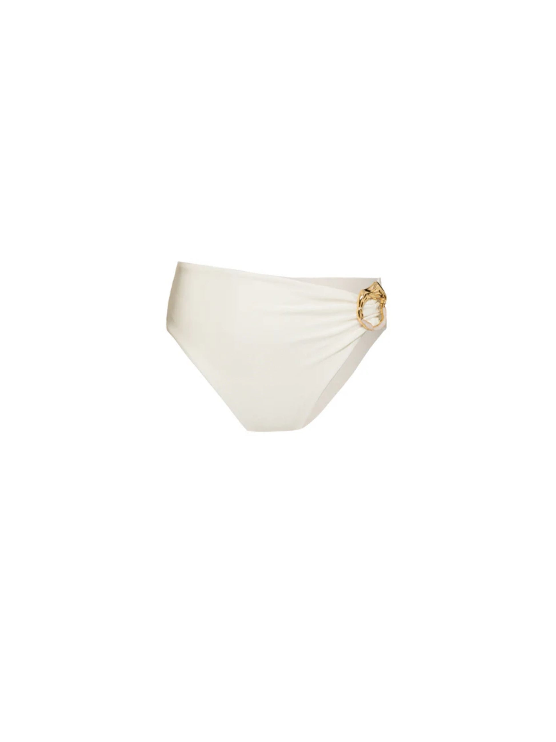 Mid-rise bikini bottom with a high-cut design and a delicate ring accent on one side. Offers a balanced blend of medium to cheeky coverage, perfect for those who want a subtle yet stylish look.